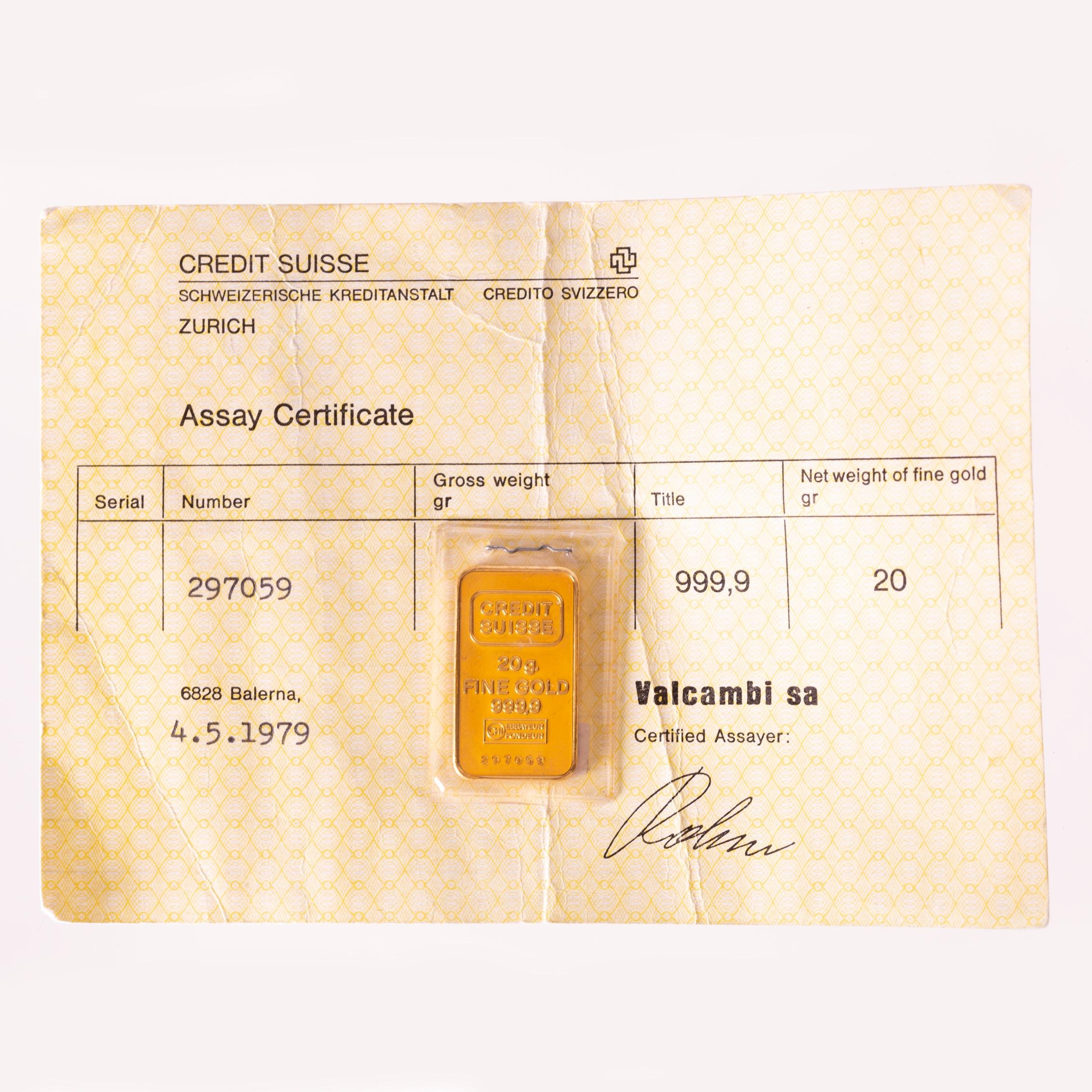 Lingote en oro fino del Credit Suisse. Peso 20 gr. No. 297059. Con certificado.