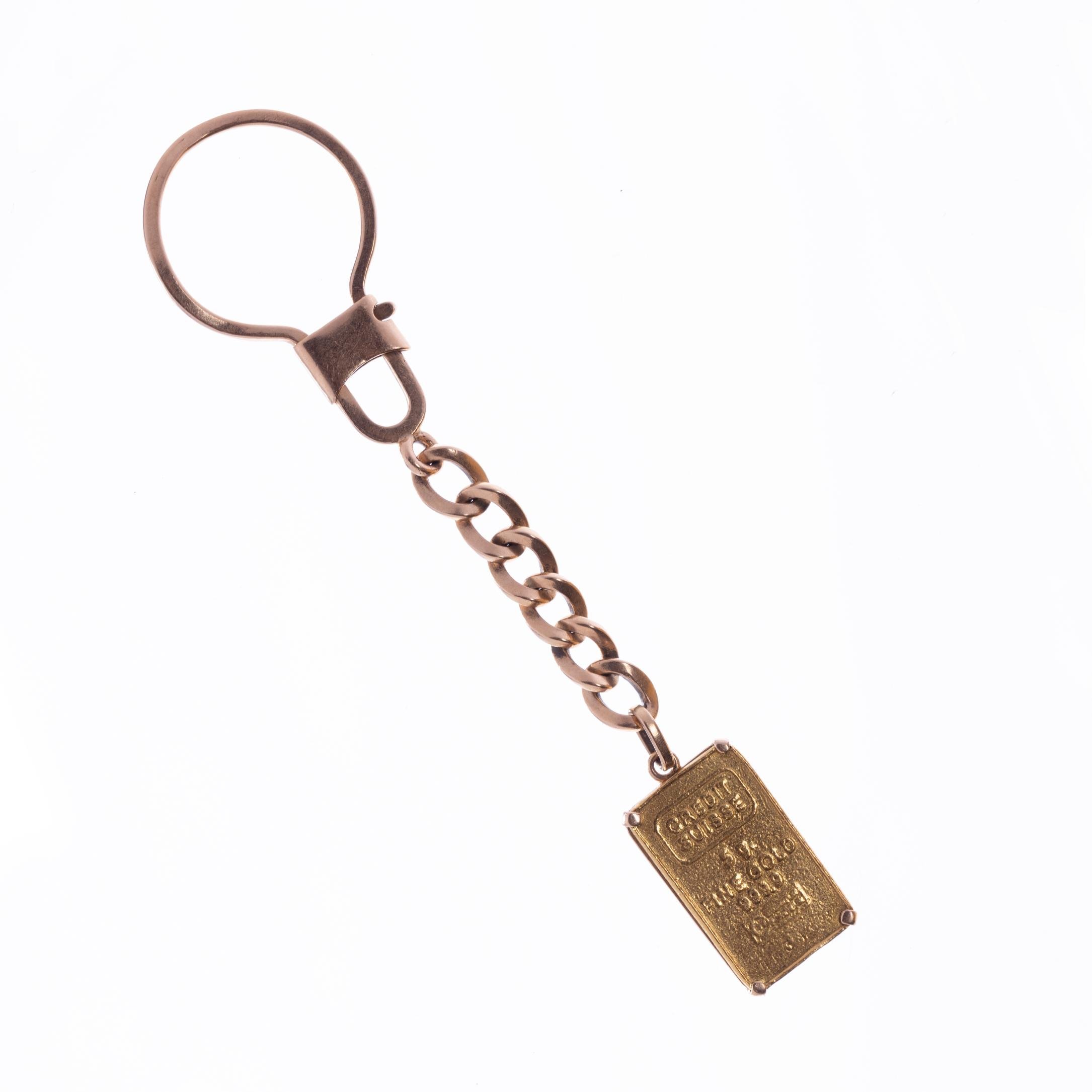 Llavero en oro 18 K amarillo con un lingote de 5 gr en oro fino del Credit Suisse. Peso total 14,5 gr.