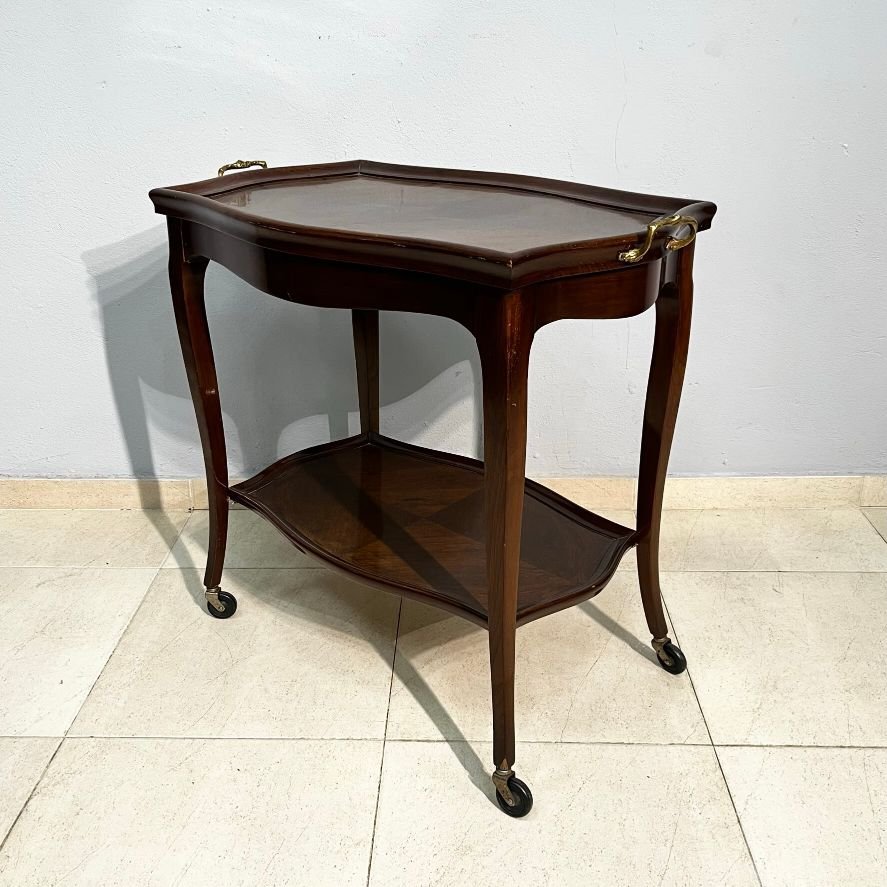 Mesa de servir tipo wagon estilo Luis XV, rectangular, con dos estantes y asas laterales. Cuatro patas con rueditas. 74 x 83 x 50 cm.