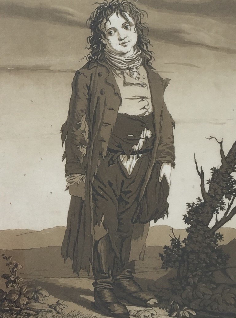 BUCHHORN, Ludwig (escuela alemana, 1770-1856). Aguafuerte, perteneciente a la serie «La juventud mendigante». Firmado con tinta abajo a la derecha. 25 x 20 cm.