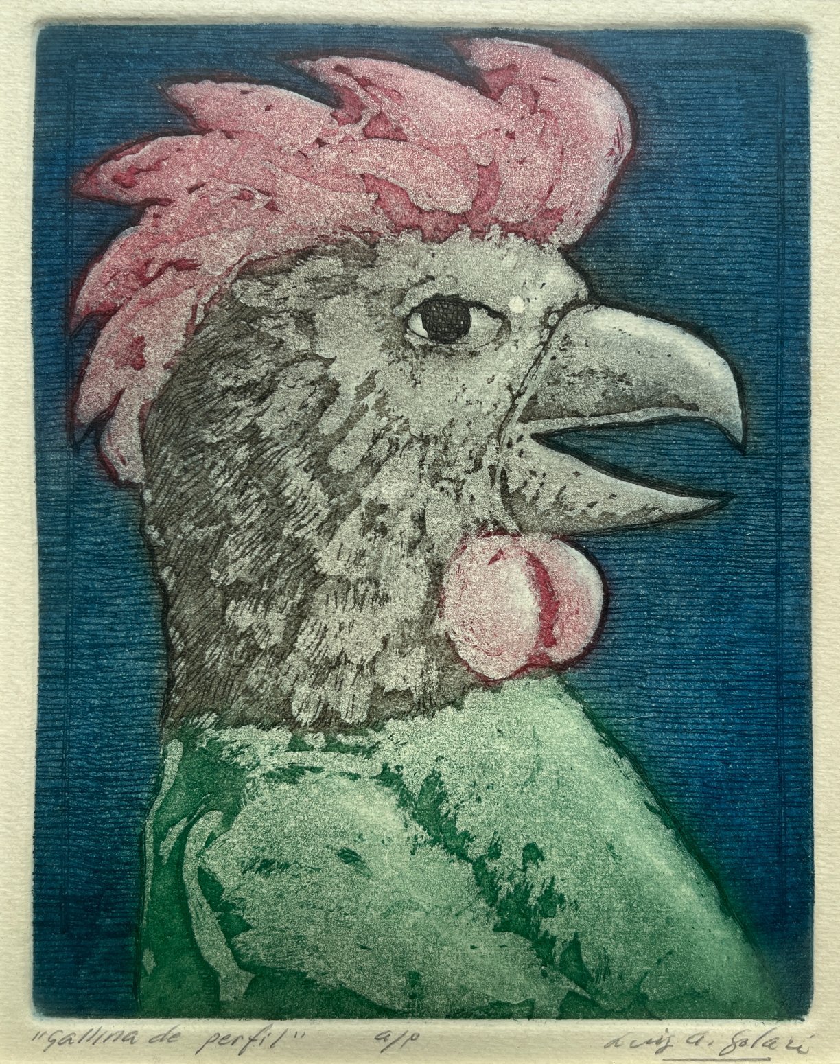 LUIS ALBERTO SOLARI. Grabado color. «Gallina de perfil.» Firmado a lápiz abajo a la izquierda y titulado a lápiz abajo a la izquierda fuera del grabado. 20.5 x 16 cm.