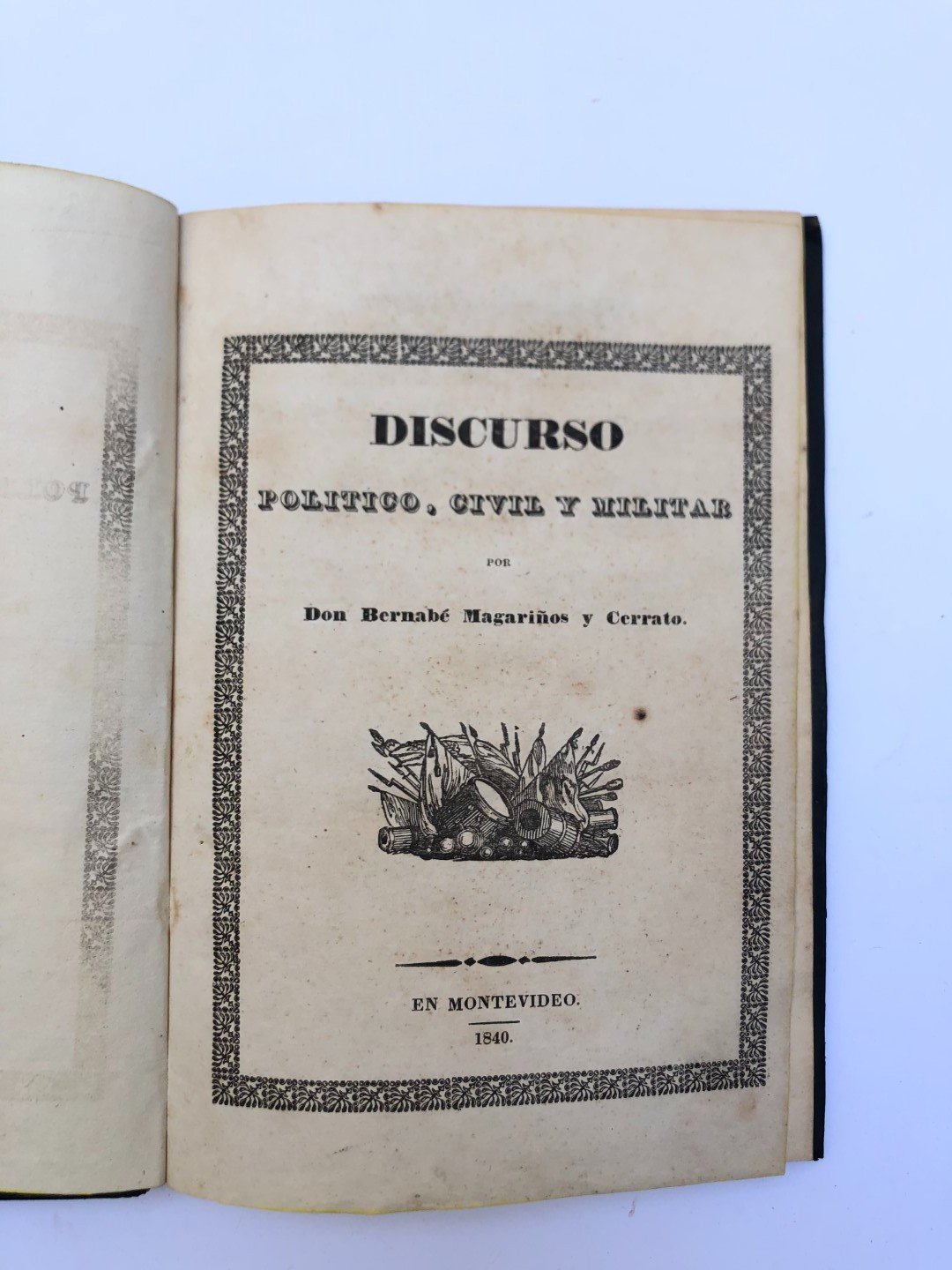 MAGARIÑOS Y CERRATO, Bernabé: Discurso político, civil y militar. Montevideo, Imprenta de la Caridad. 1840. Encuadernación en pleno cuero. Exlibris Santiago Vázquez.