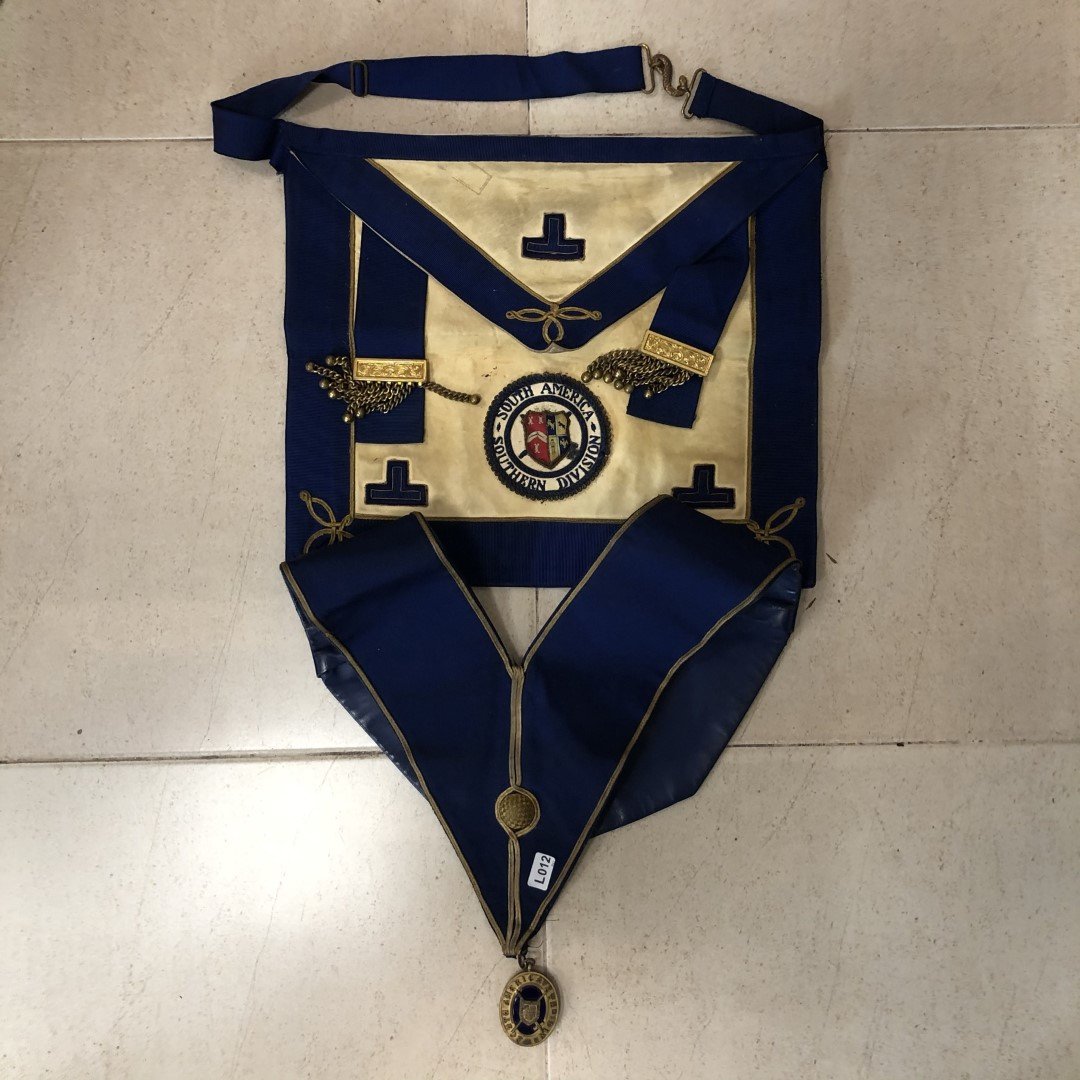 Conjunto de mandil, collarín y joya masónicos de la logia South America Southern Division. Joya en bronce dorado.