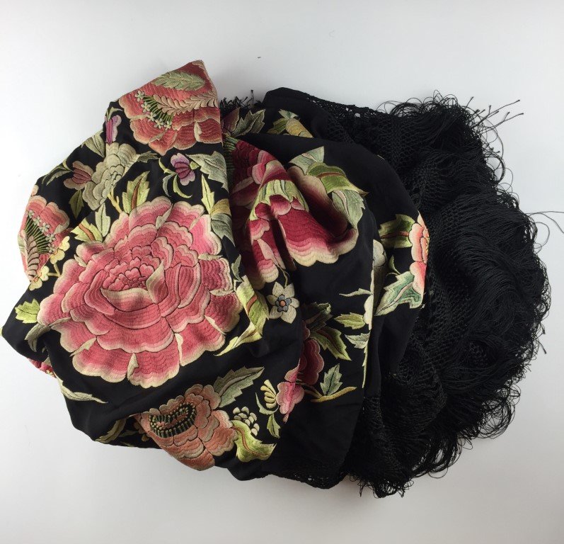 Mantón de manila en seda color negro bordada «hojas y flores» en hilos de seda. Medida sin flecos 140 x 140 cm.