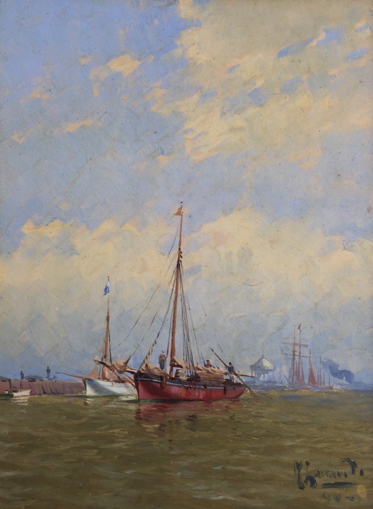 LARRAVIDE, Manuel (escuela uruguaya, 1831-1910). Óleo sobre cartón. “Puerto de Buenos Aires.” Firmado y fechado “1894” abajo a la derecha. 32 x 22 cm.