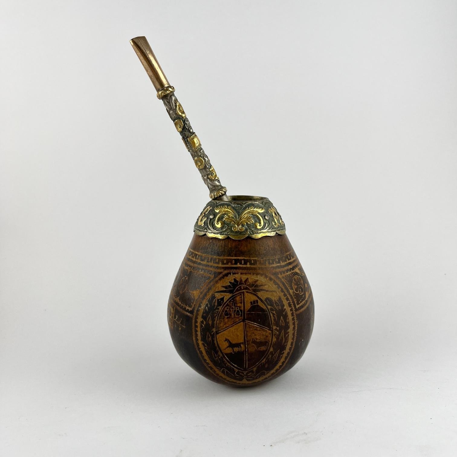 Mate en calabaza marrón burilada «escudo de armas uruguayo» y «efigie de José Batlle y Ordóñez», fechado «1952». Con virola en plata y oro cincelada con iniciales «F.G.A.». Acompañado por bombilla en plata y oro cincelada «hojas y flores».