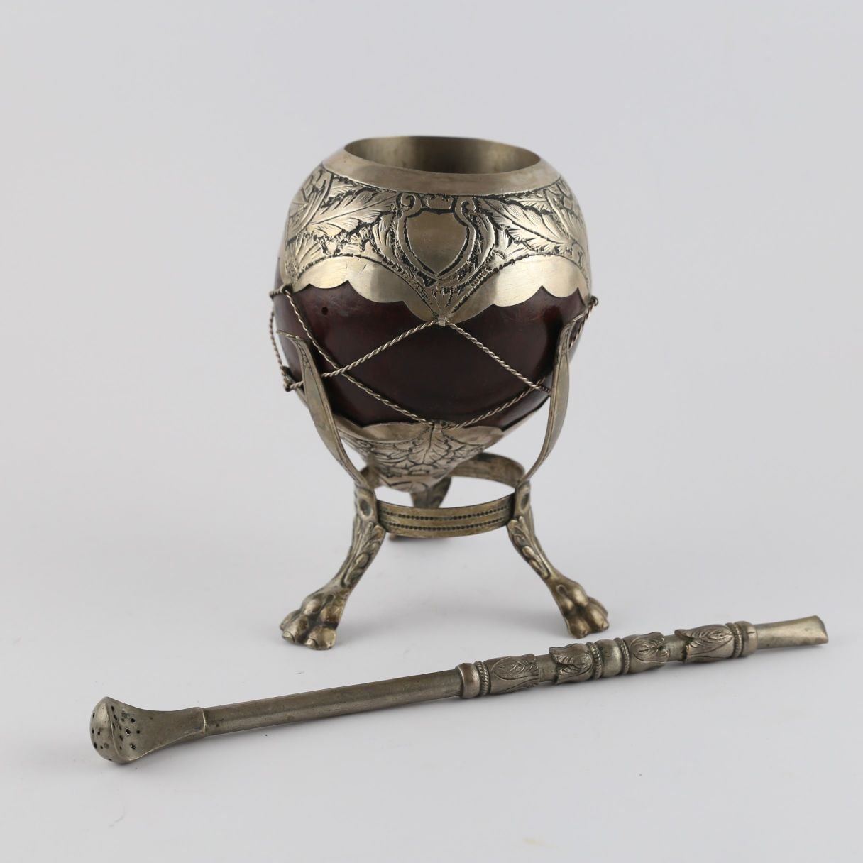 Mate riograndense en calabaza marrón con base y virola en plata cincelada «hojas y flores». Alto 11 cm. Acompañado por bombilla en plata cincelada y soporte en metal de tres patas esculturadas “garras”.
