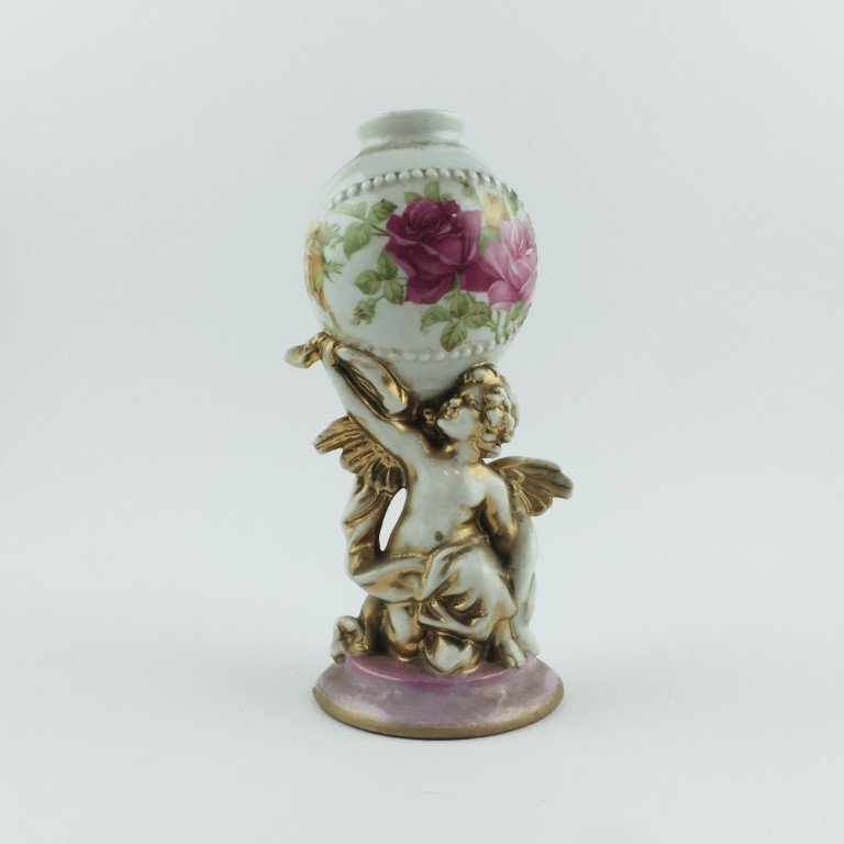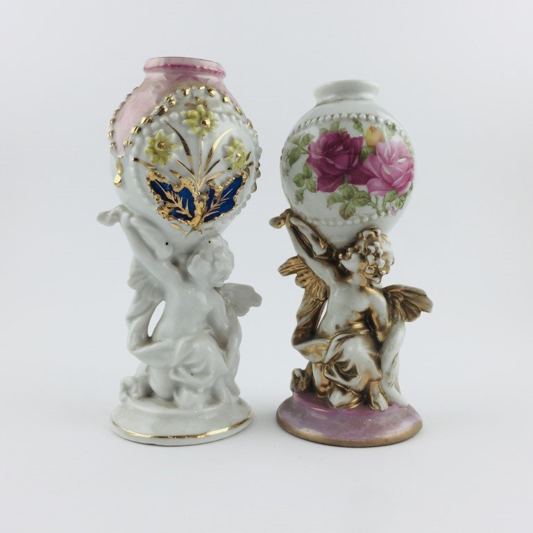 Dos mates en porcelana isabelina, diferentes, decorados «flores», con pies esculturados «ángeles».