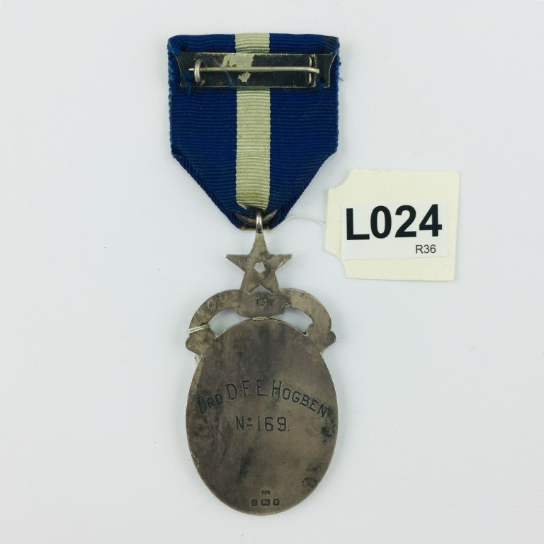 Medalla de pecho masónica en plata inglesa de Londres año 1939 con cinta azul y blanca e inscripción «Aegros Sanat Humanitas», ofrecida a Bro. D.F.E. Hogben, No 169.