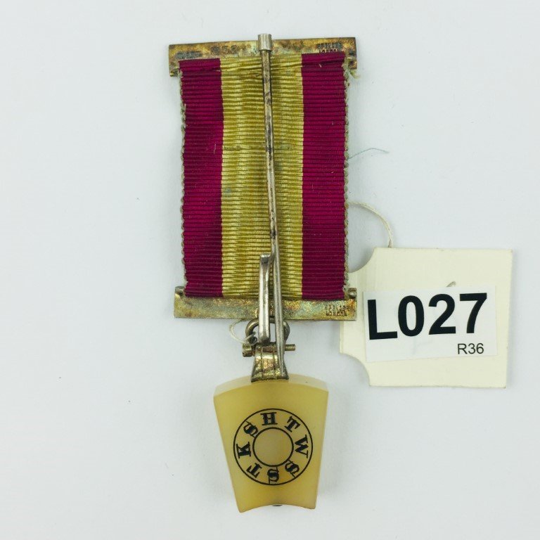Medalla de pecho masónica en plata vermeil de Londres año 1909, con colgante en ágata y cinta color rojo y blanco, perteneciente a la logia Royal Arch.