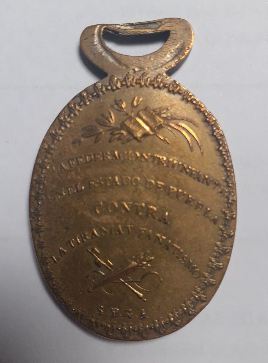 Medalla mexicana en bronce, con inscripción «El gobierno de la unión a los defensores la Puebla 1833”.