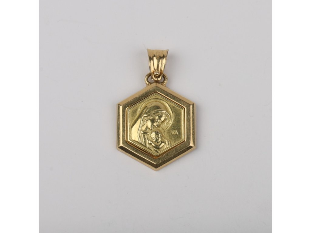 Medalla hexagonal en oro 18 K amarillo. «Virgen con Niño.» Diámetro 23 mm. Peso 4 gr.
