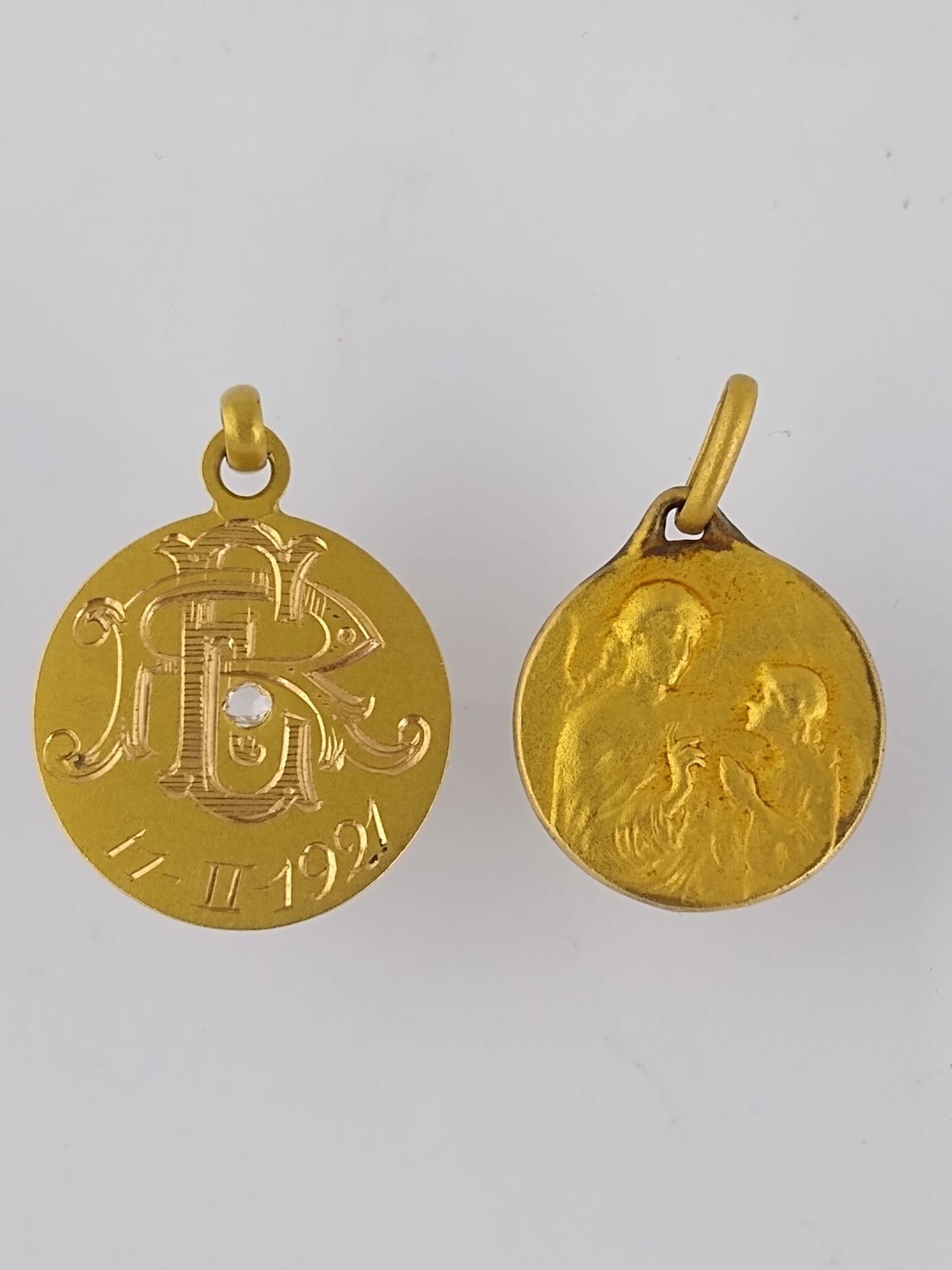 Dos pequeñas medallas, una en oro 18 K amarillo (peso 2 gr) y otra enchapada en oro.