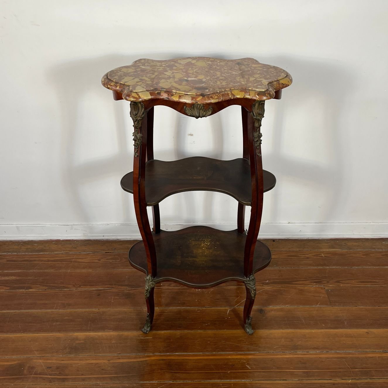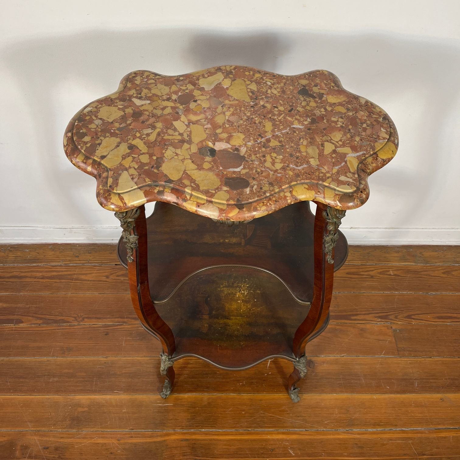 Mesa auxiliar estilo Luis XV enchapada en palo de rosa, con monturas en bronce cincelado. Dos estantes pintados a mano «paisajes». Tapa en mármol veteado. 89 x 35 x 54 cm.