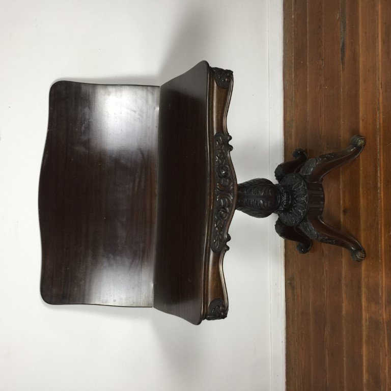 Mesa de arrimo inglesa tipo libro, en caoba tallada «hojas y flores», con pie central de cuatro patas talladas «hojas». 73 x 86 x 43 cm.