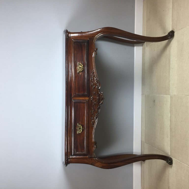 Mesa de arrimo portuguesa estilo João V, siglo XVIII, en madera de jacarandá tarugada. Frente y laterales tallados «rocalla». Dos cajones con tiradores en bronce. 79 x 121 x 56 cm.