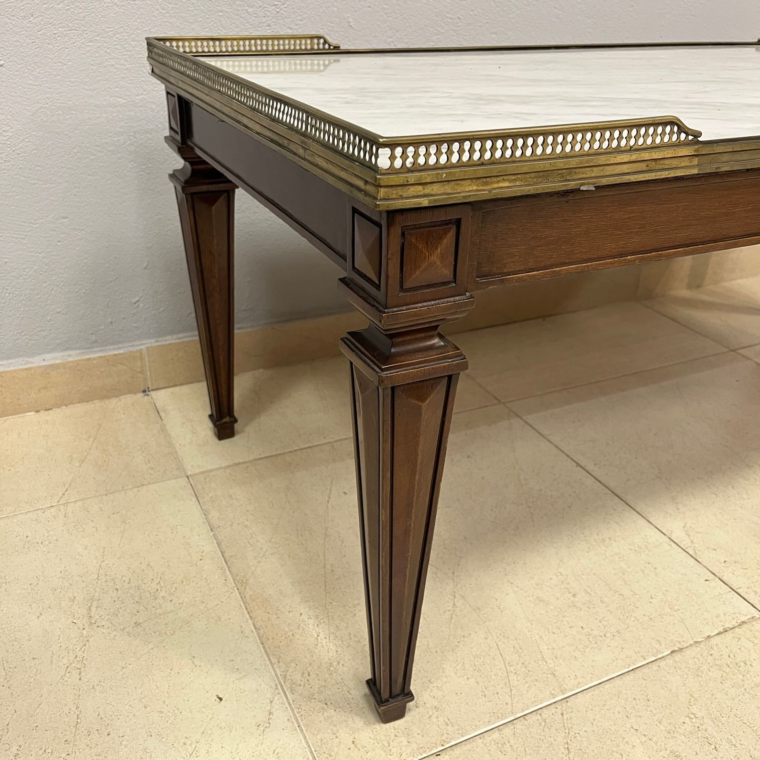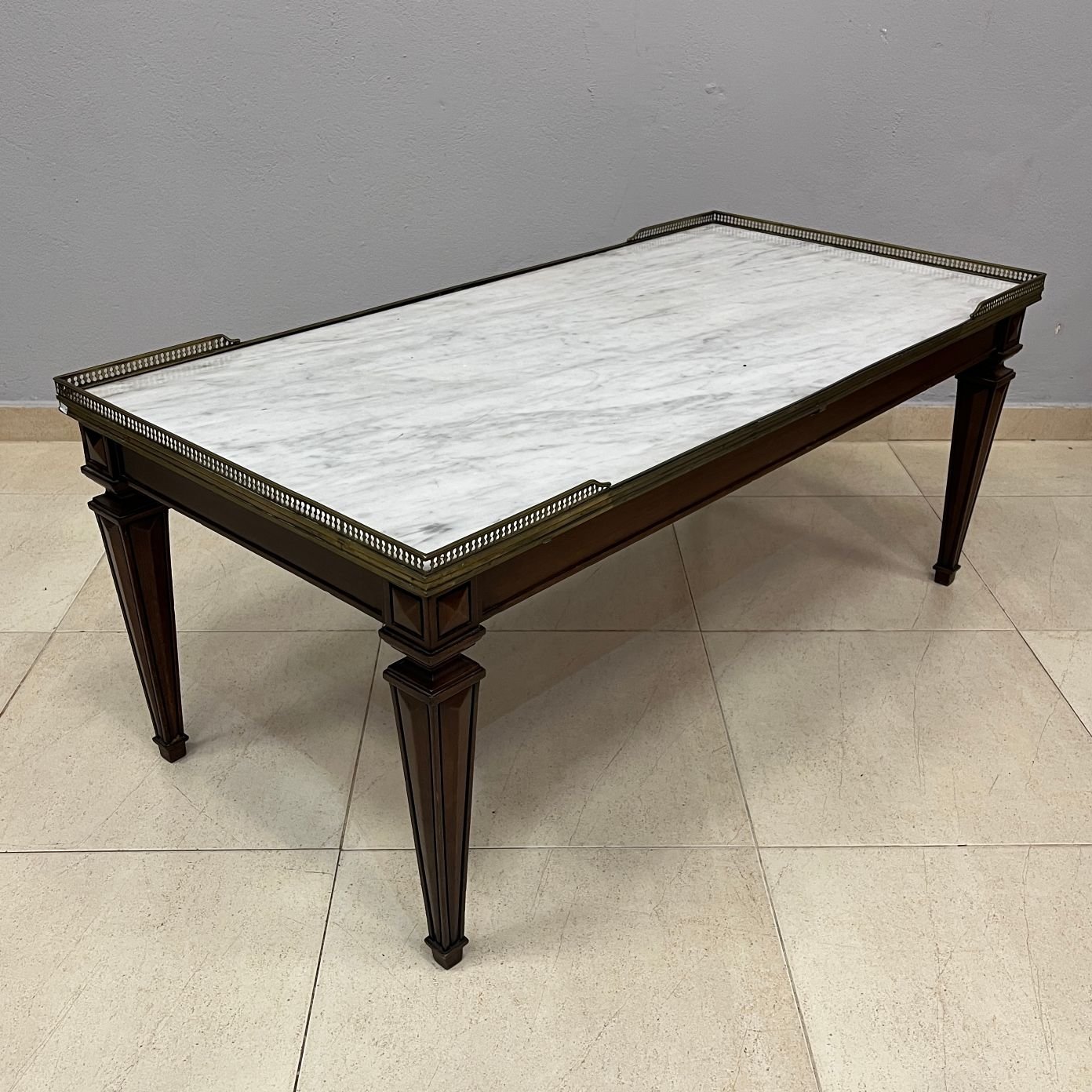 Mesa de centro rectangular inglesa en madera de caoba. Tapa en mármol veteado blanco y gris, baranda en bronce calado y cuatro patas. 48 x 114 x 56 cm.