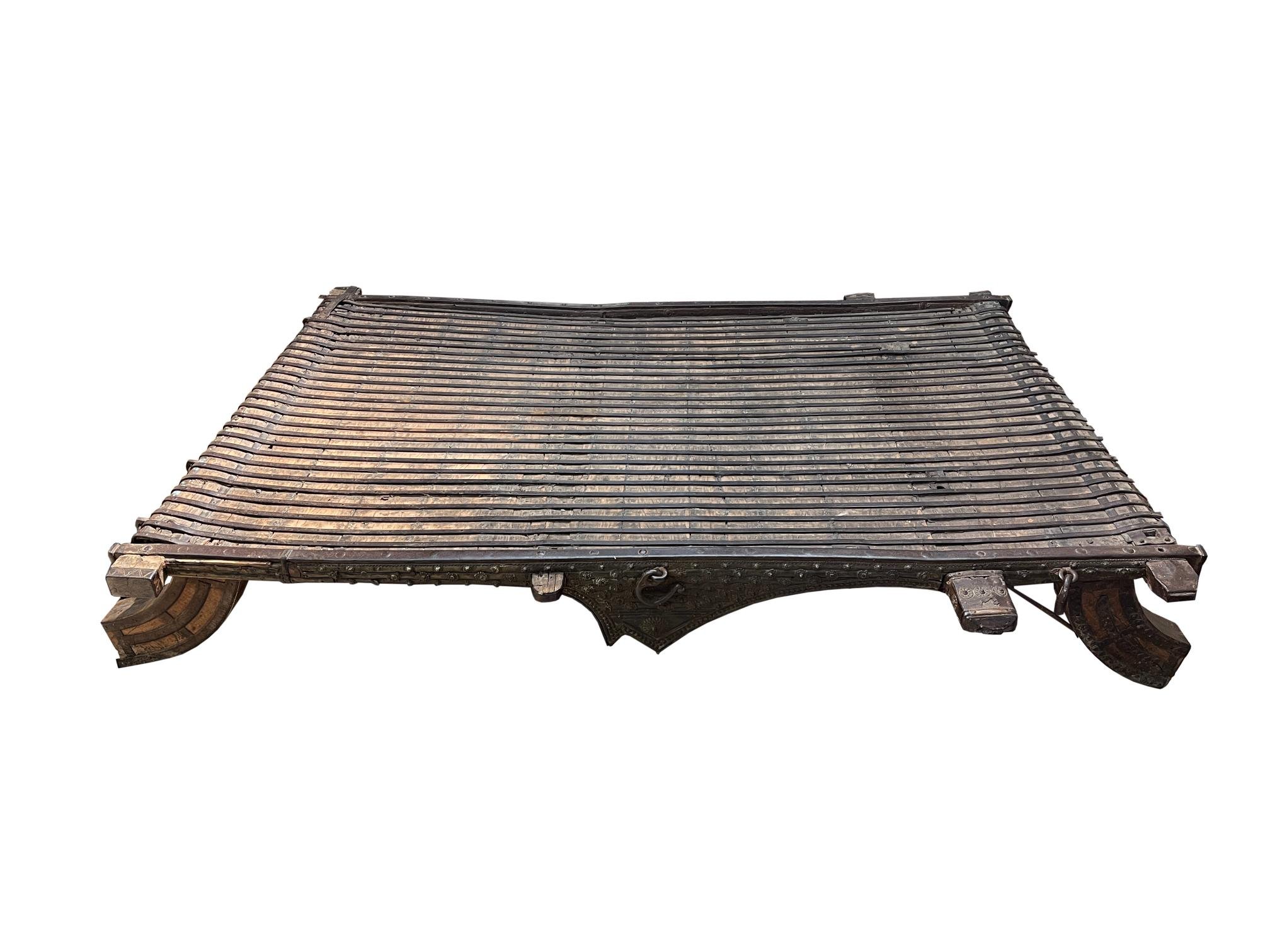 Mesa de centro de la India, s. XIX, realizada con piso de carro, en madera dura, con fajas, ganchos, y clavos en hierro forjado. 40 x 210 x 153 cm.