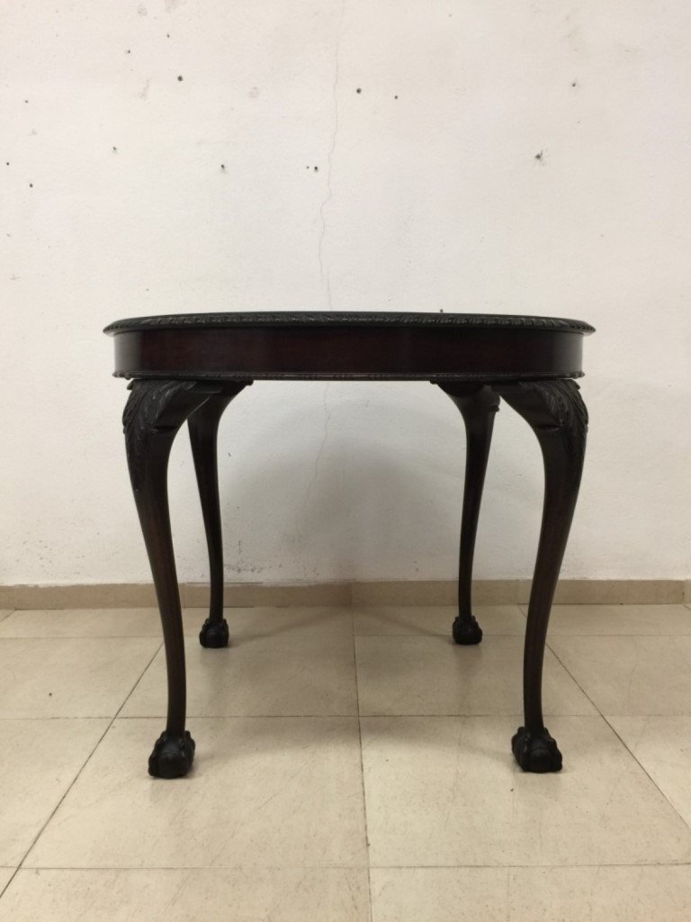 Mesa redonda inglesa estilo Chippendale, en caoba. Cuatro patas esculturadas «garras y esfera». 74 x 95 cm.