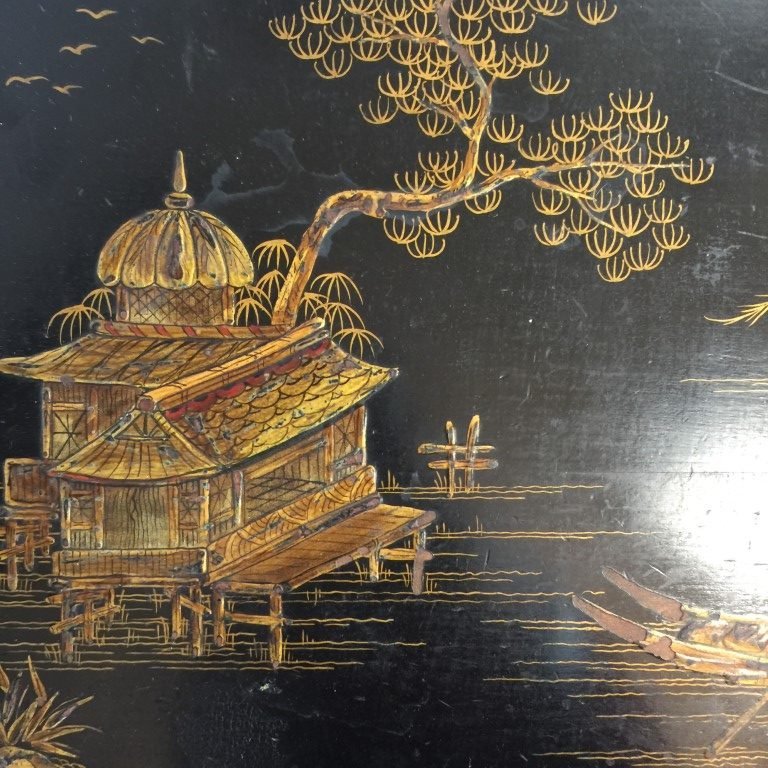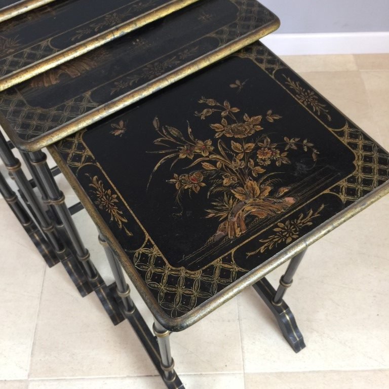 Juego de cuatro mesas nidos chinoiserie en madera laqueada color negro decorada «escenas típicas» en dorado. Medidas mesa mayor 67 x 55 x 40 cm.
