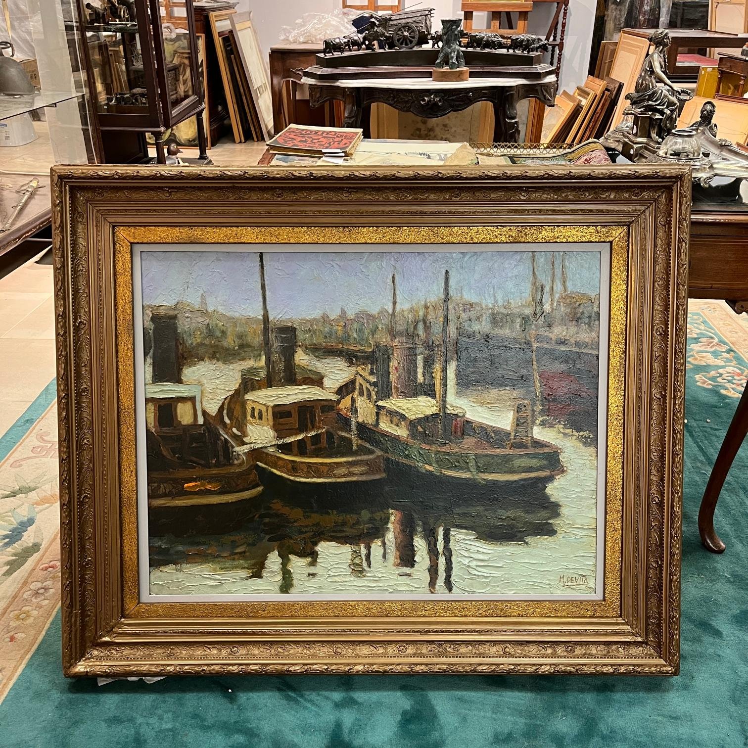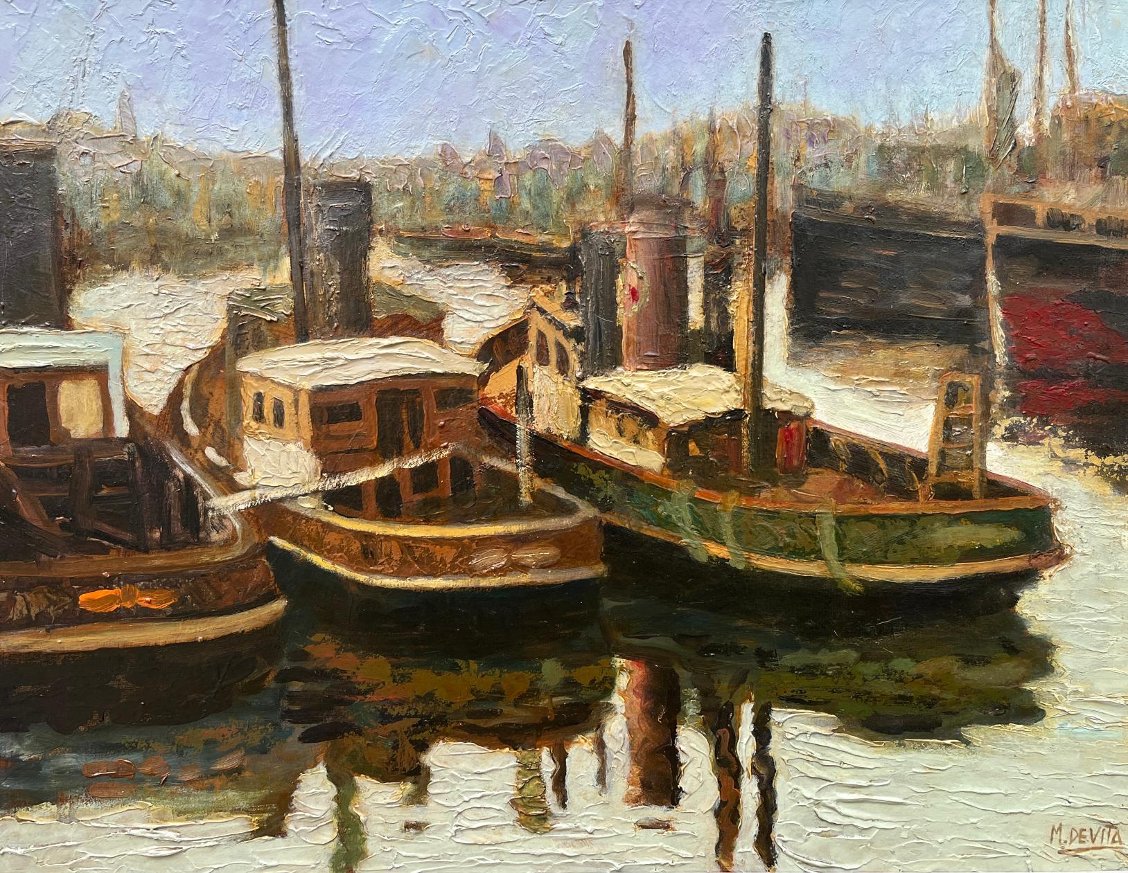 MIGUEL DE VITA (Escuela uruguaya, 1923-2004) Óleo sobre cartón «Remolcadores» Firmado abajo a la derecha 62.5 x 82 cm