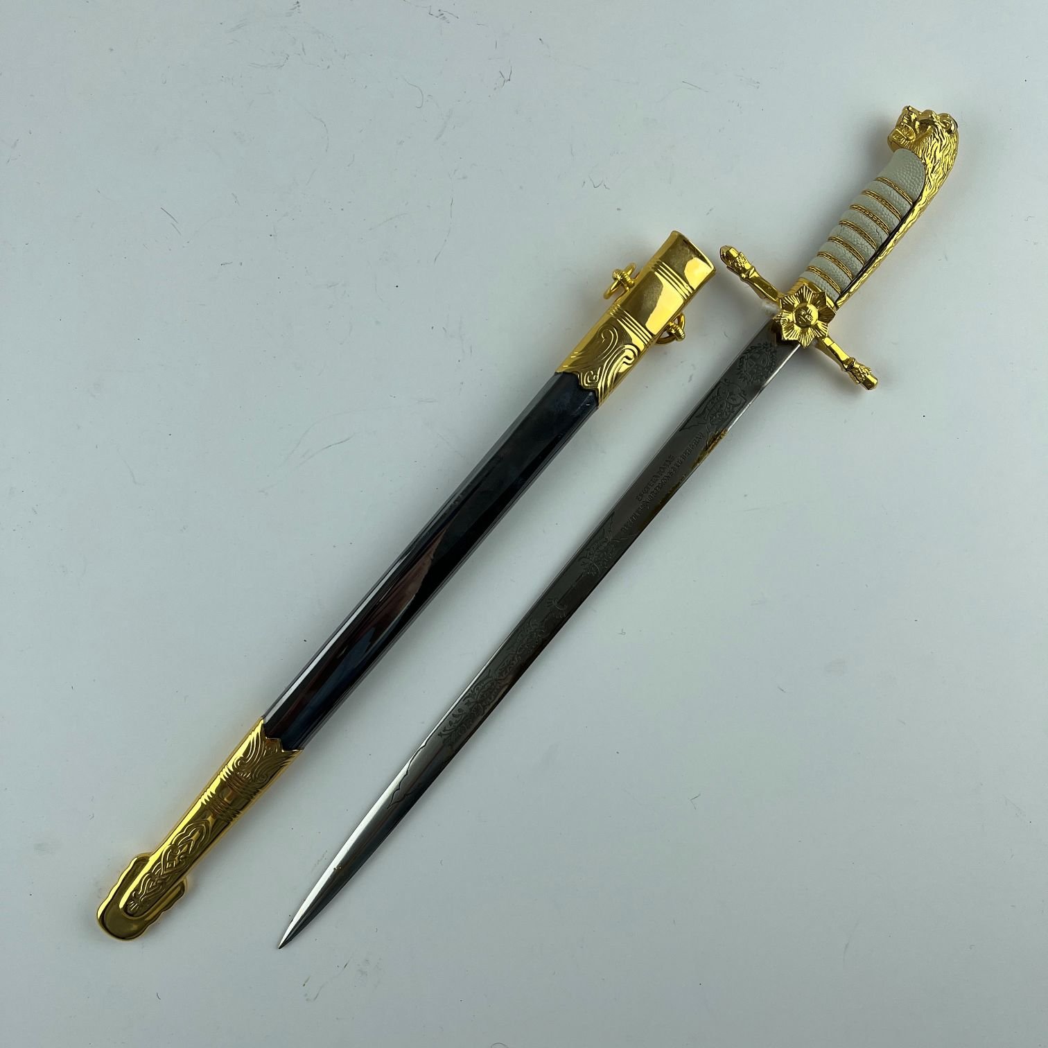 Miniatura de sable de la armada uruguaya fabricado por Eberle, Brasil. Hoja grabada el ácido. Largo 30 cm. Con vaina y caja originales.