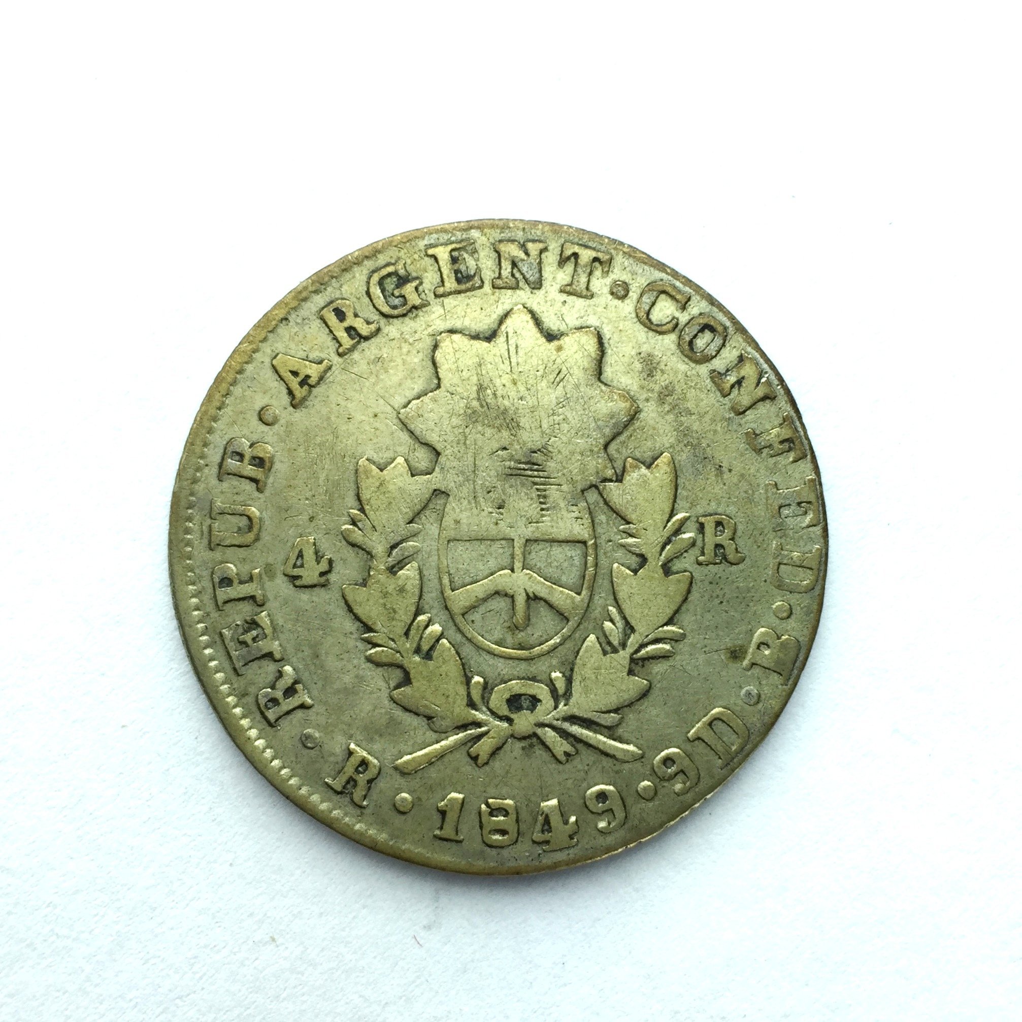 Moneda argentina en plata año 1849 denominación 4 reales. Inscripción «Eterno Loor al Restaurador Rosas» en anverso.