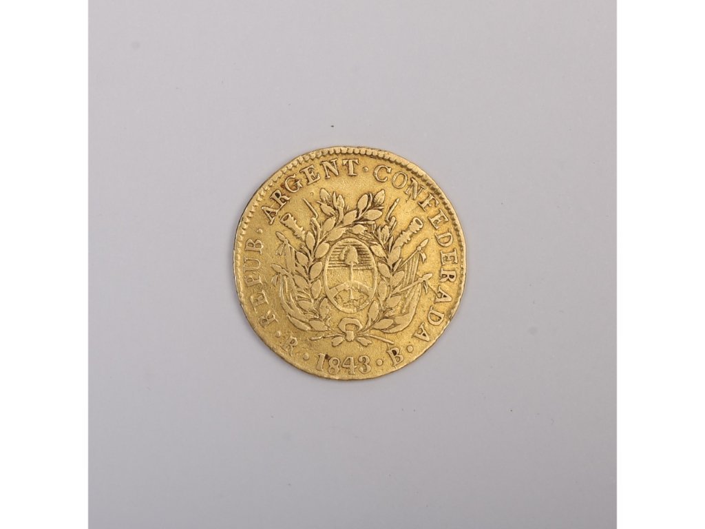 Moneda argentina en oro denominación 2 escudos del año 1843, período federal. Peso 6.53 gr.