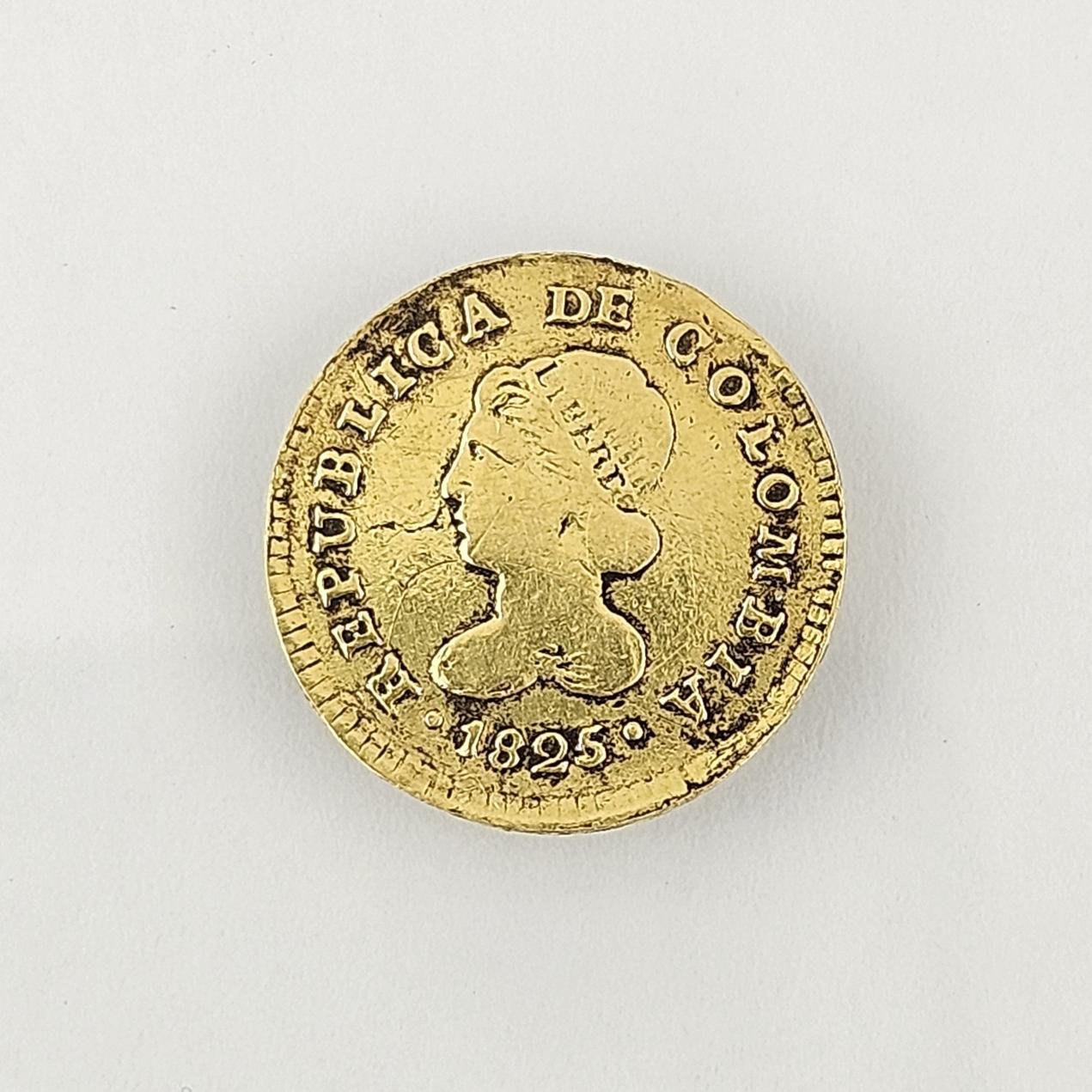 Moneda colombiana en oro denominación 1 escudo de Popayán del año 1825.