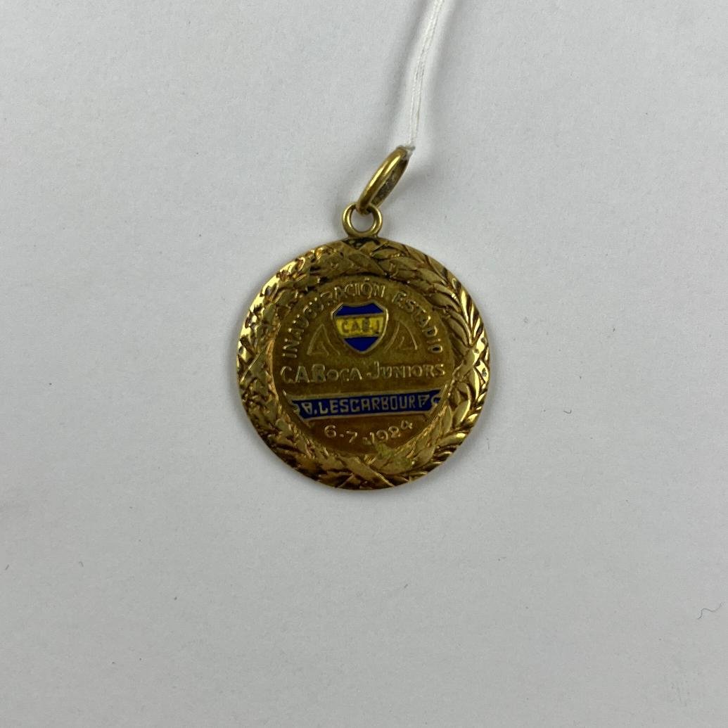 Medalla en oro club atlético Boca Juniors, conmemorativa inauguración del estadio 6 Julio 1924, con escudo y nombre de socio esmaltados.