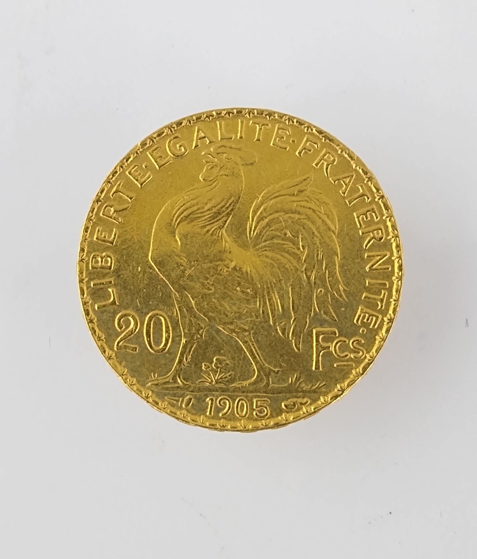 Moneda francesa en oro denominación 20 francos del año 1905.