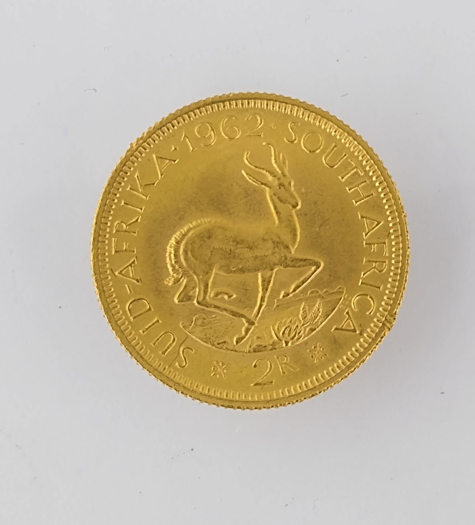 Moneda sudafricana en oro denominación 2 rands del año 1962.