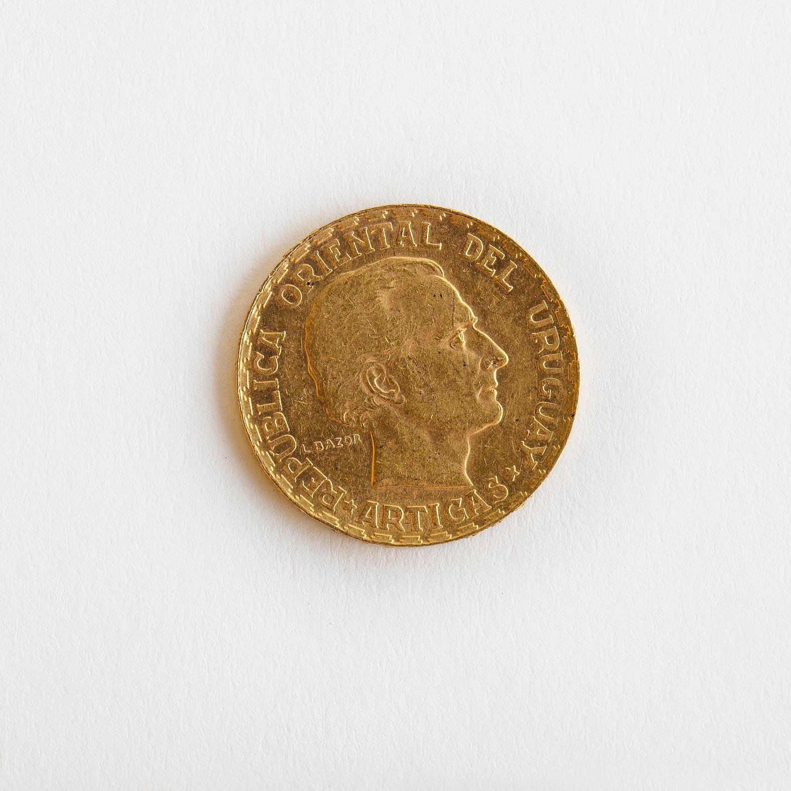 Moneda uruguaya en oro denominación 5 pesos del año 1930.