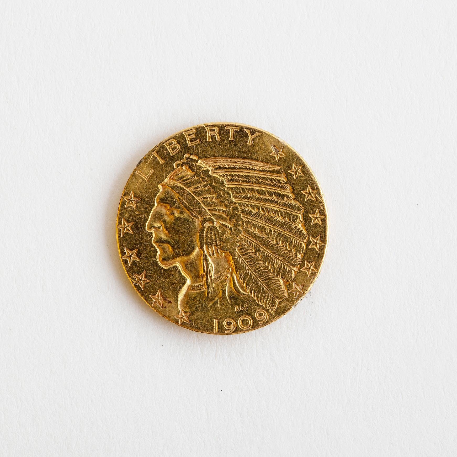 Moneda estadounidense en oro denominación 5 dólares del año 1909. Peso 8.35 gr. Diámetro 21.5 mm.
