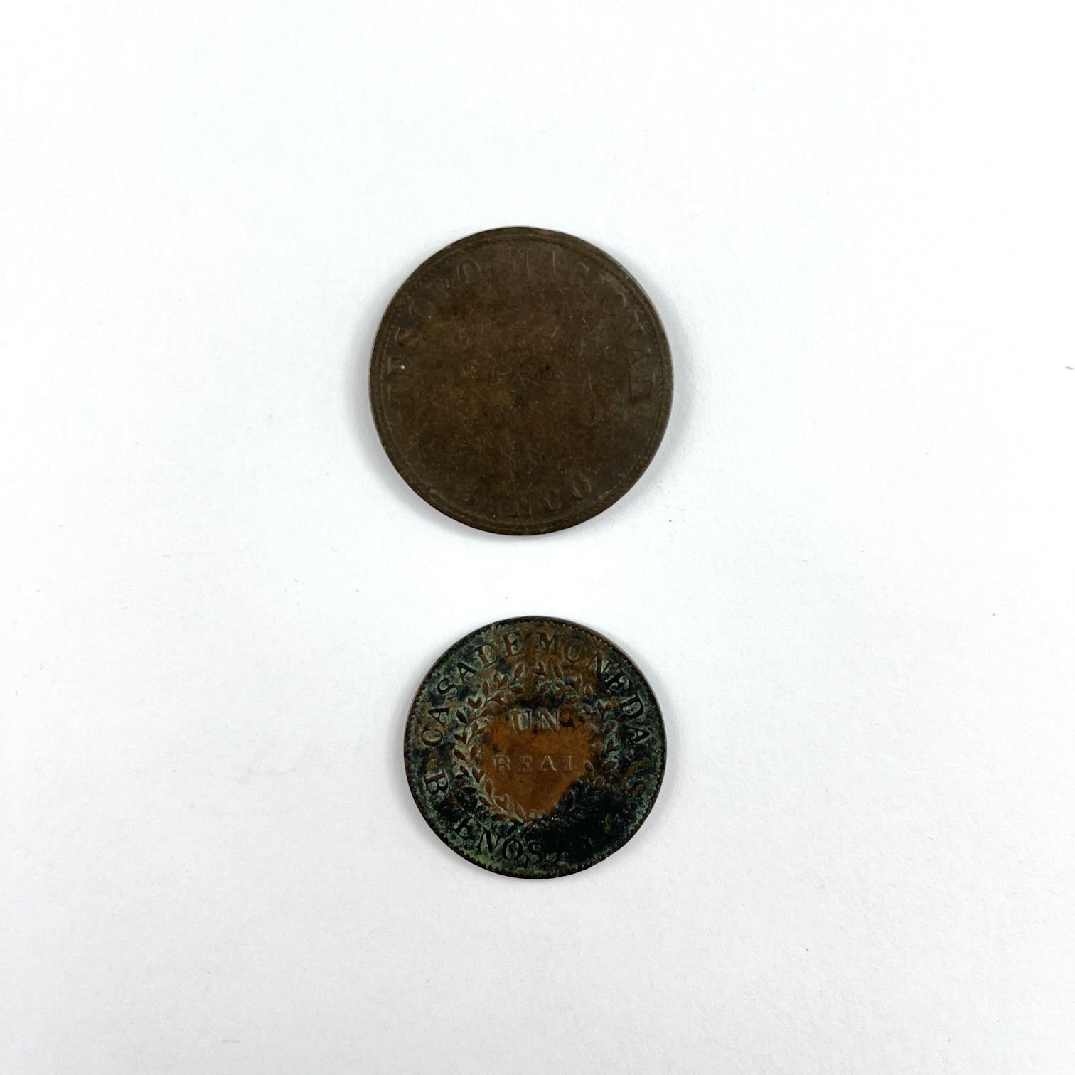 Dos monedas argentinas en cobre denominaciones 1 real año 1840 y 2 centavos año 1854.