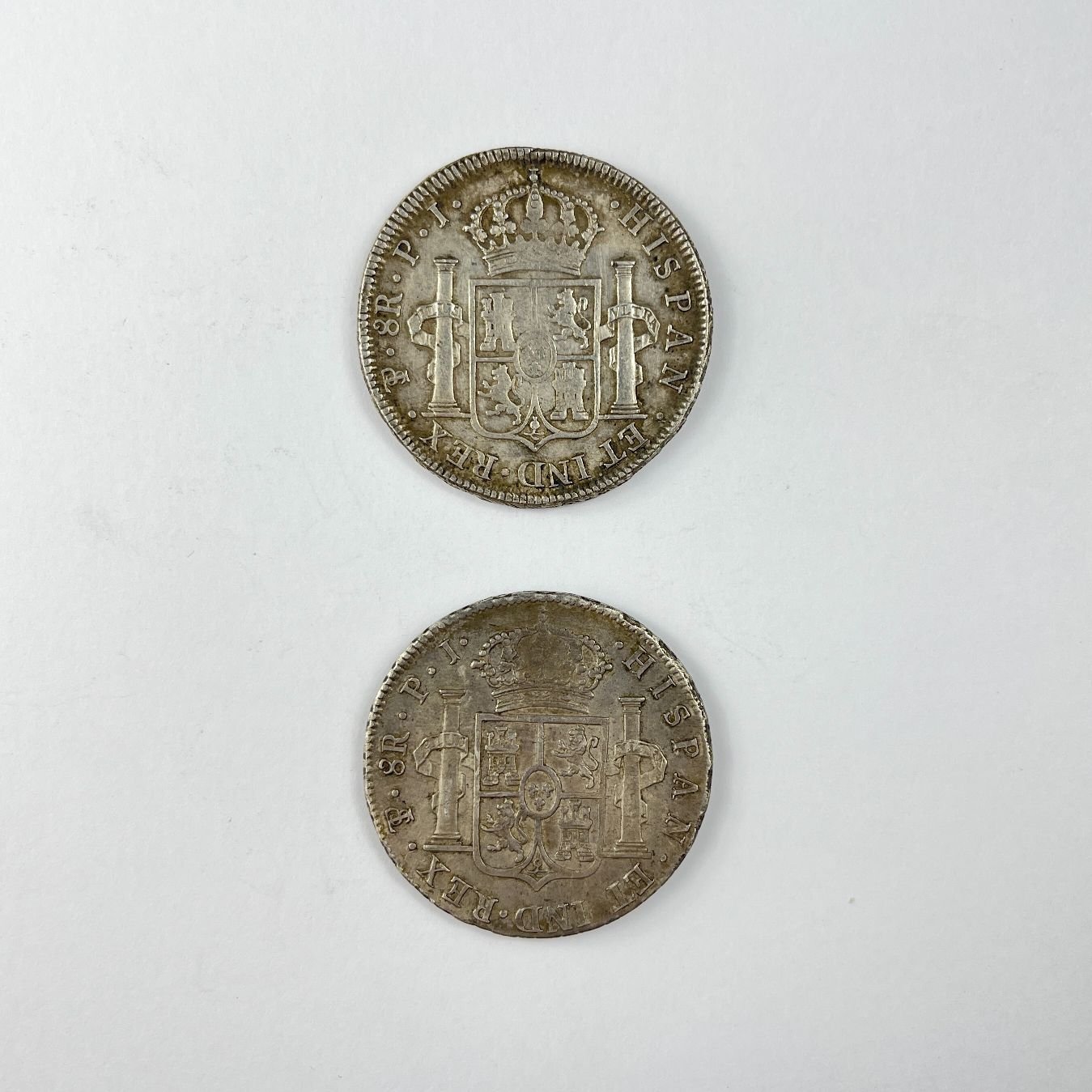 Dos monedas españolas en plata denominación 8 reales años 1816 y 1823. Diámetros 40 y 39 mm. Peso 27.2 y 27 gr.