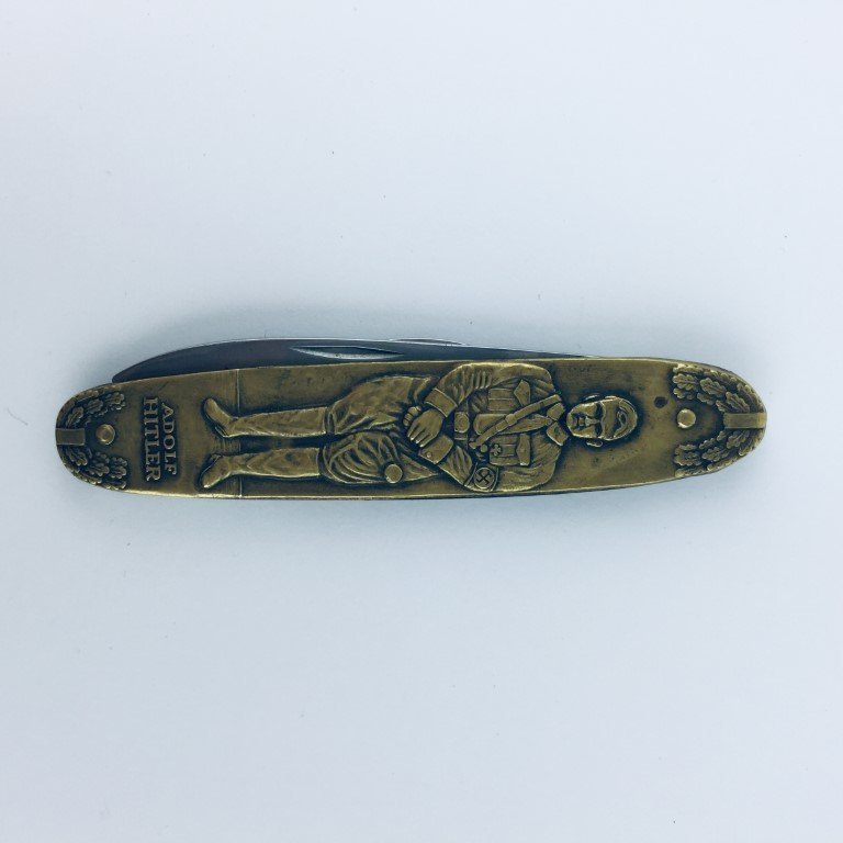 Navaja alemana de la Juventud Hitleriana, fabricada por Solingen. Dos hojas, una grabada al ácido con inscripciones. Cachas en bronce cinceladas «Adolf Hitler» e imagen de batalla naval. Largo cerrado 8.5 cm.