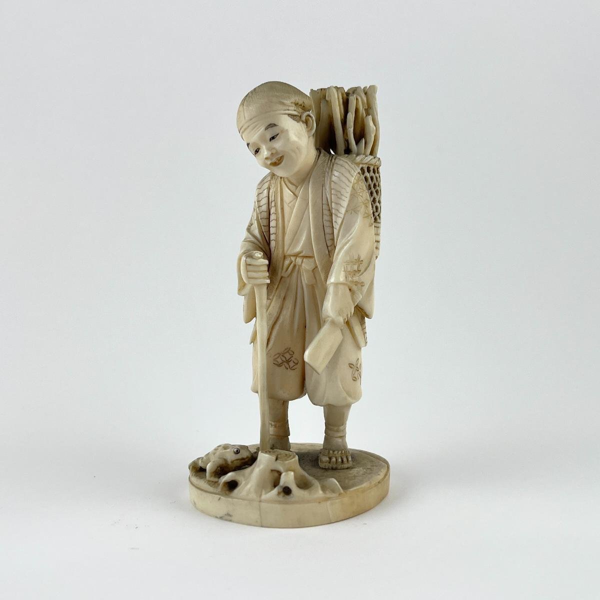 Okimono japonés en marfil sello rojo tallado. «Maki hiroi, recolector de leña.» Firmado en la base. Período Meiji. Alto 9,5 cm.