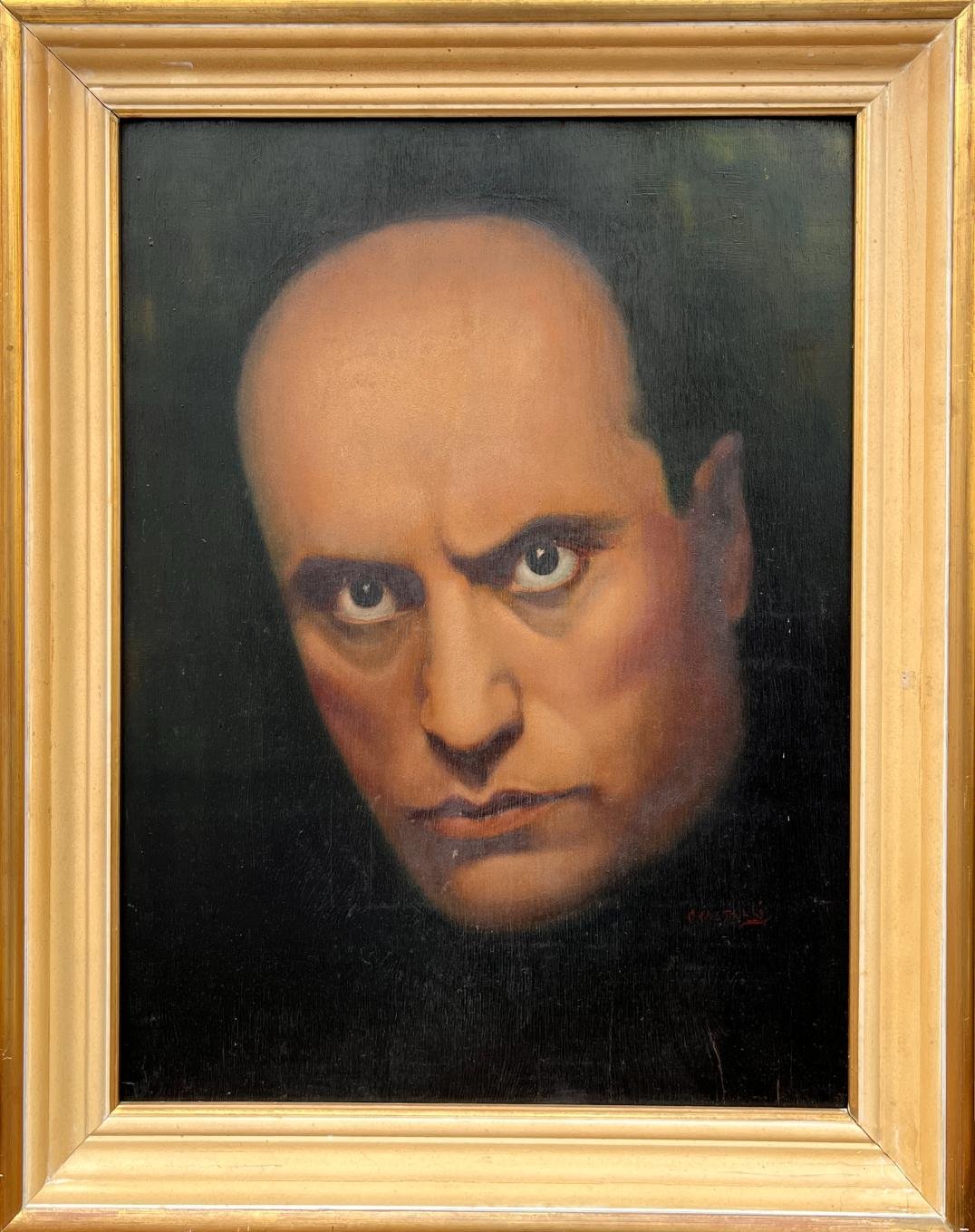 Óleo sobre tabla. «Retrato de Benito Mussolini.» Firmado «Castelli» abajo a la derecha. 61 x 45 cm.