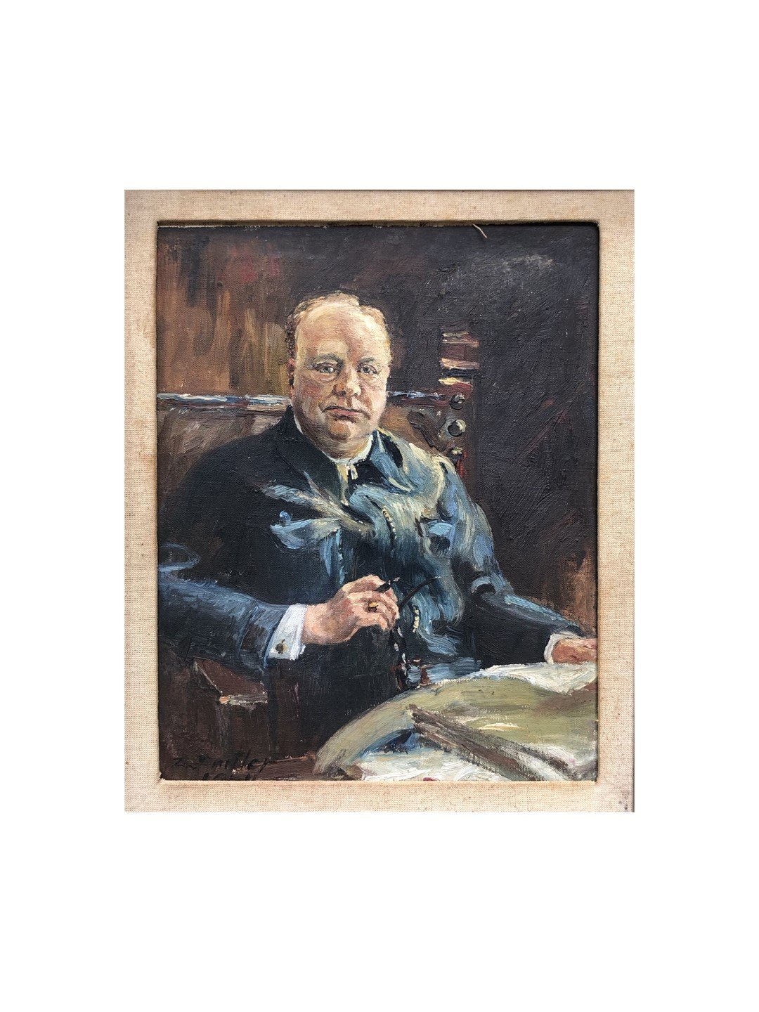 BATILER, Zoma (escuela uruguaya, 1908-1994). Óleo sobre tela. «Retrato de Sir Winston Churchill.» Firmado abajo a la izquierda. 33 x 26 cm.