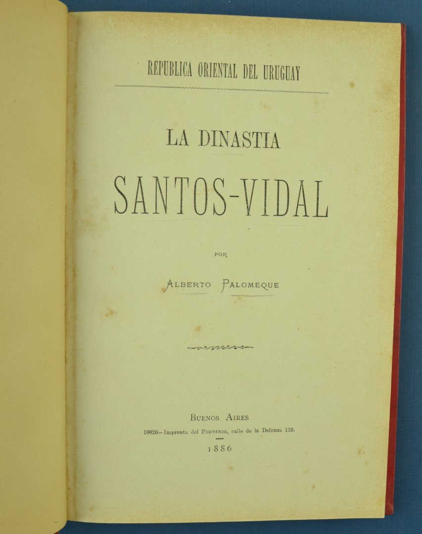 PALOMEQUE, Alberto: La dinastía SANTOS-VIDAL (…). Buenos Aires, Imprenta del Porvenir. 1886. Gran encuadernación en pleno cuero. Con dedicatoria firmada y fechada 1894.