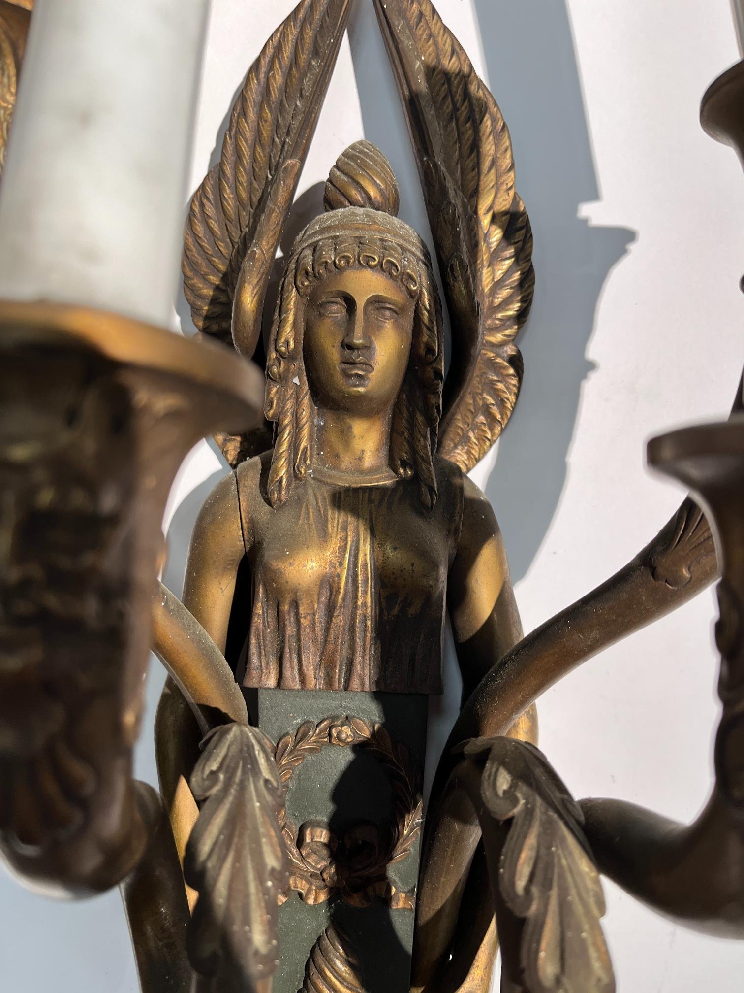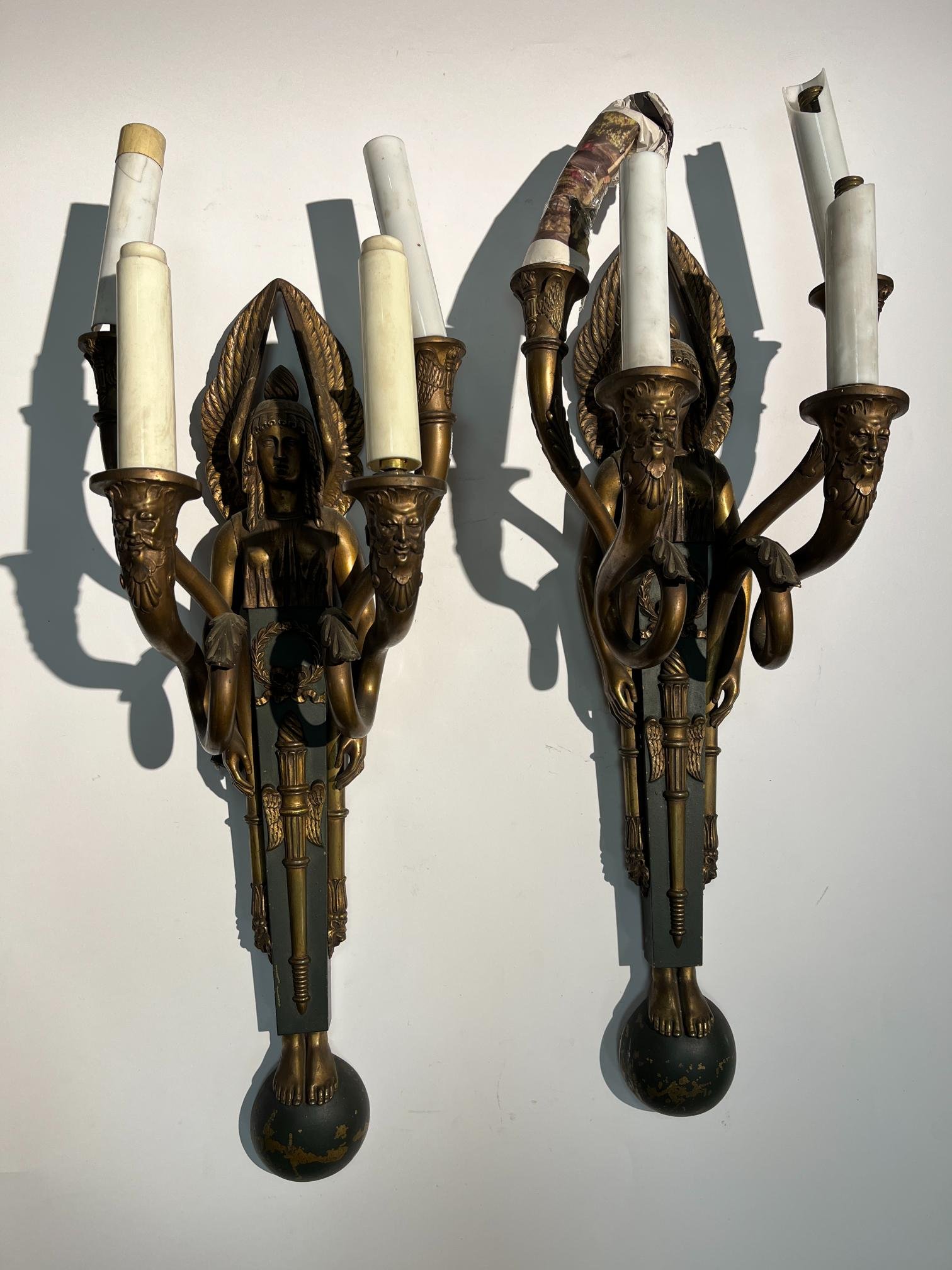 Par de apliques estilo imperio en bronce dorado con sección patinada en verde, esculturados «esfinges». Alto 56 cm.