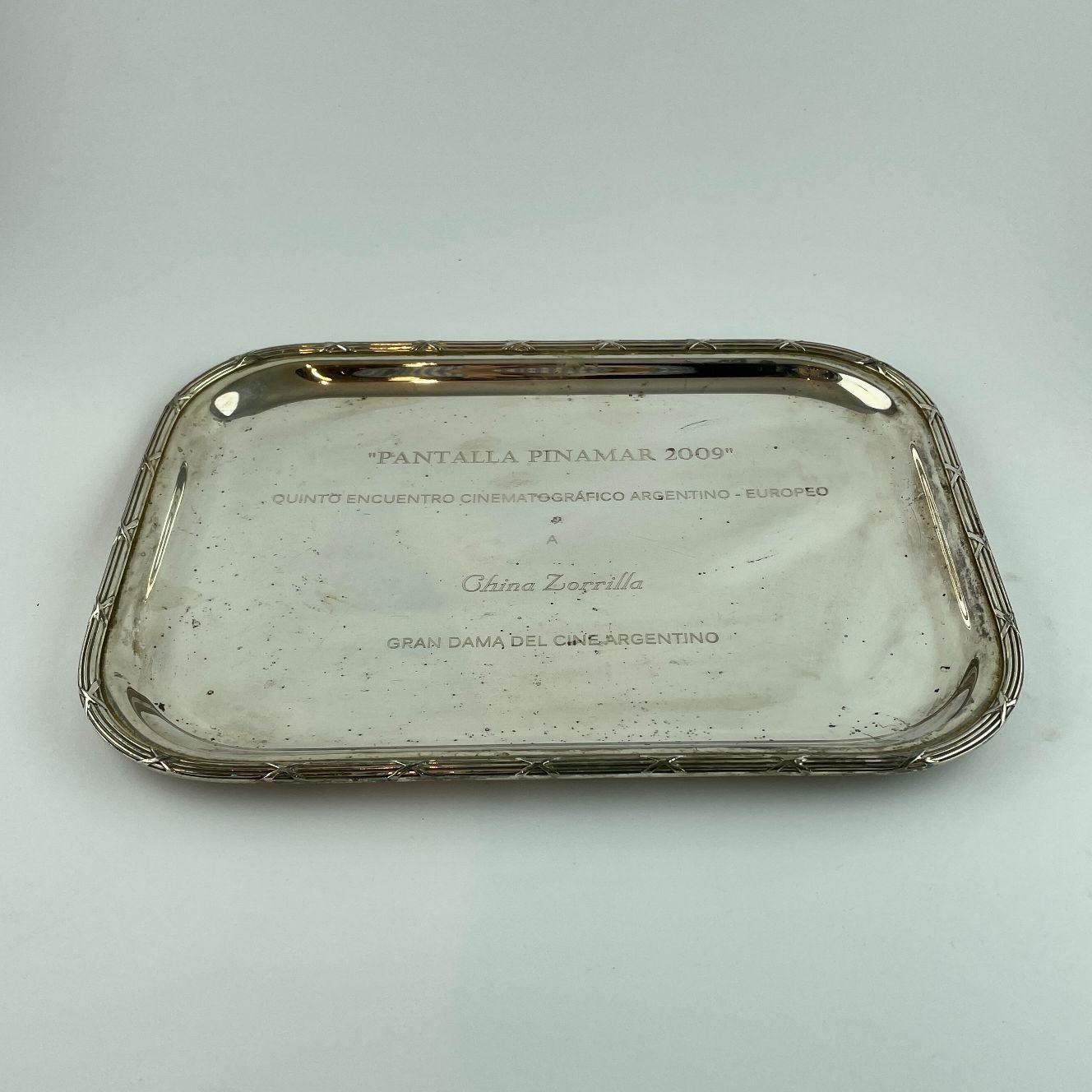Par de bandejas rectangulares en metal plateado con borde estilo Luis XVI e inscripciones «Pantalla Pinamar 2009. Quinto encuentro cinematográfico argentino-europeo. A China Zorrilla, gran dama del cine argentino» y «Pantalla Pinamar 2010. Sexto encuentro cinematográfico argentino-europeo. Reconocimiento especial edición Bicentenario. A China Zorrilla. Celebrando los veinticinco años de Esperando la Carroza.» 33 x 24 cm.