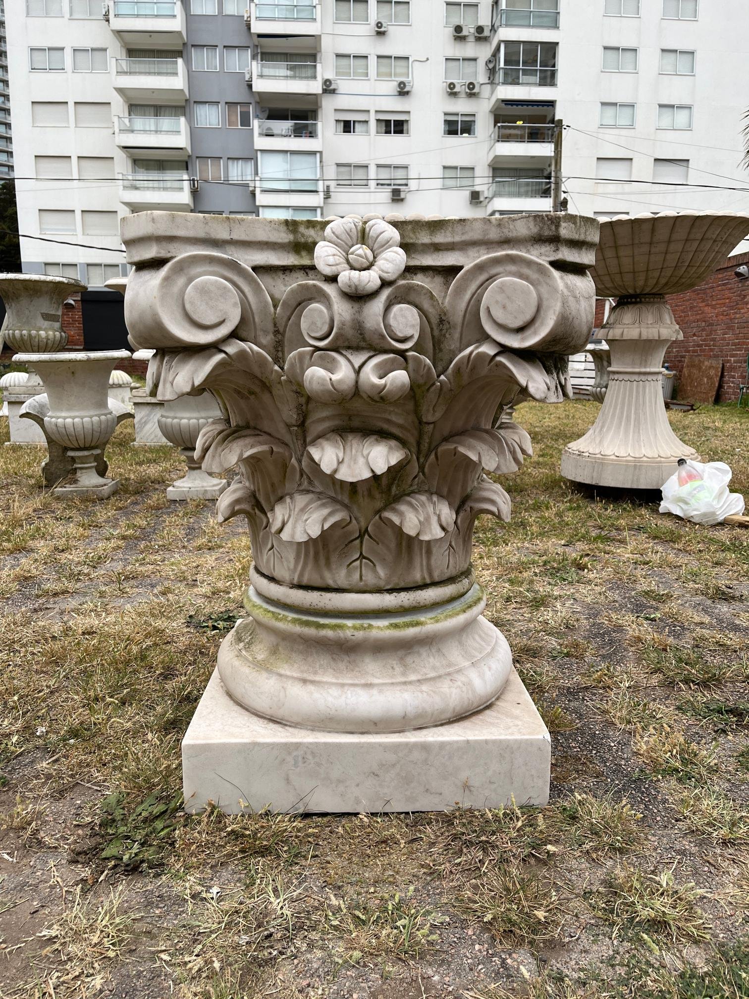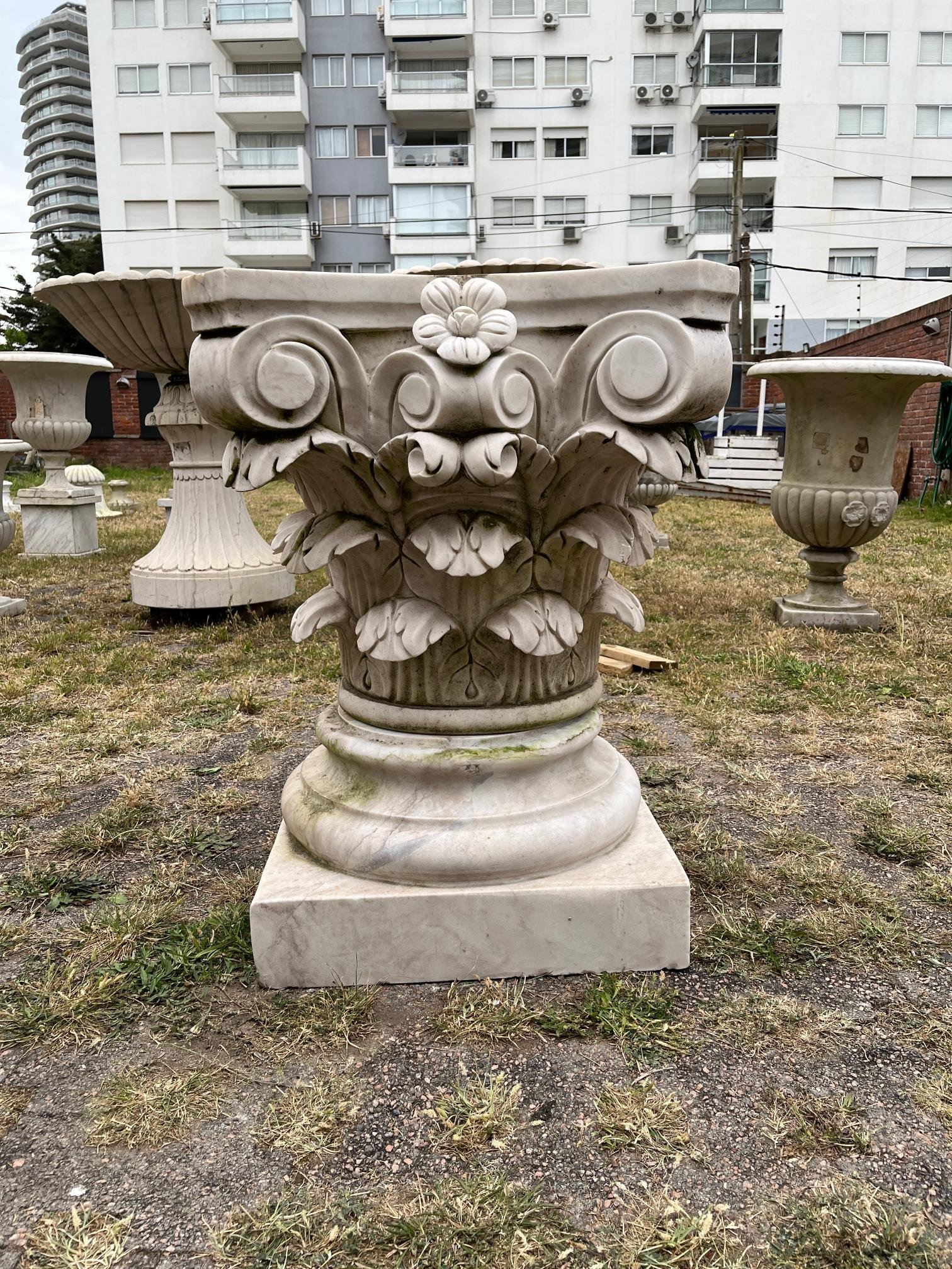 Par de capiteles corintios en mármol blanco veteado, con pedestales en mármol liso. Alto total 76 cm. Ancho 56 cm. Profundidad 56 cm.