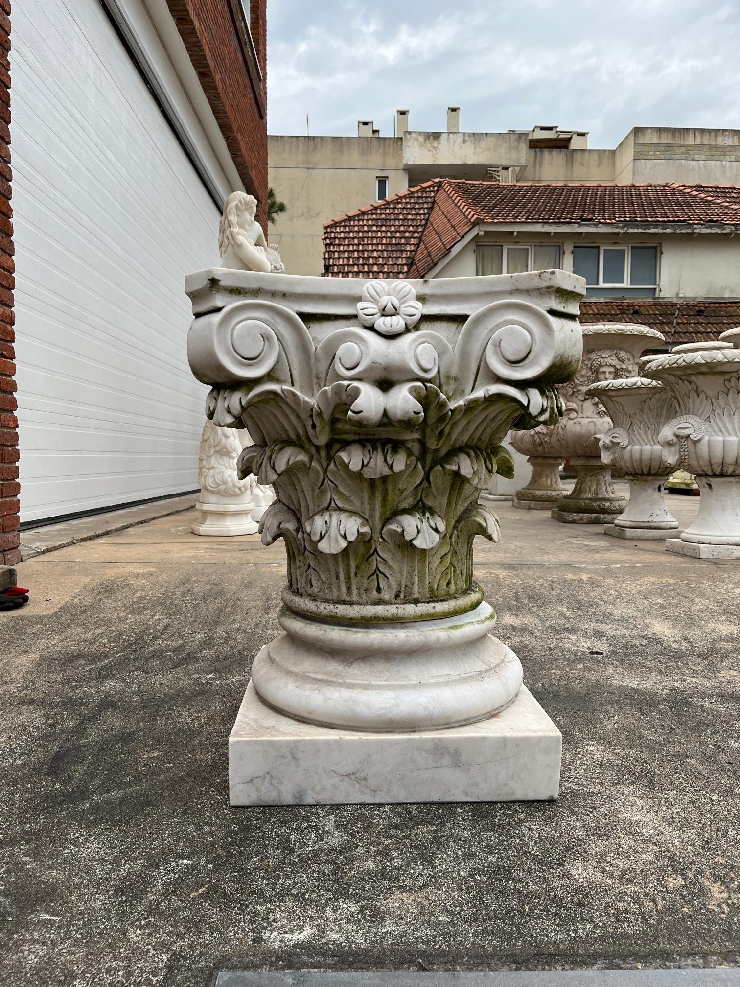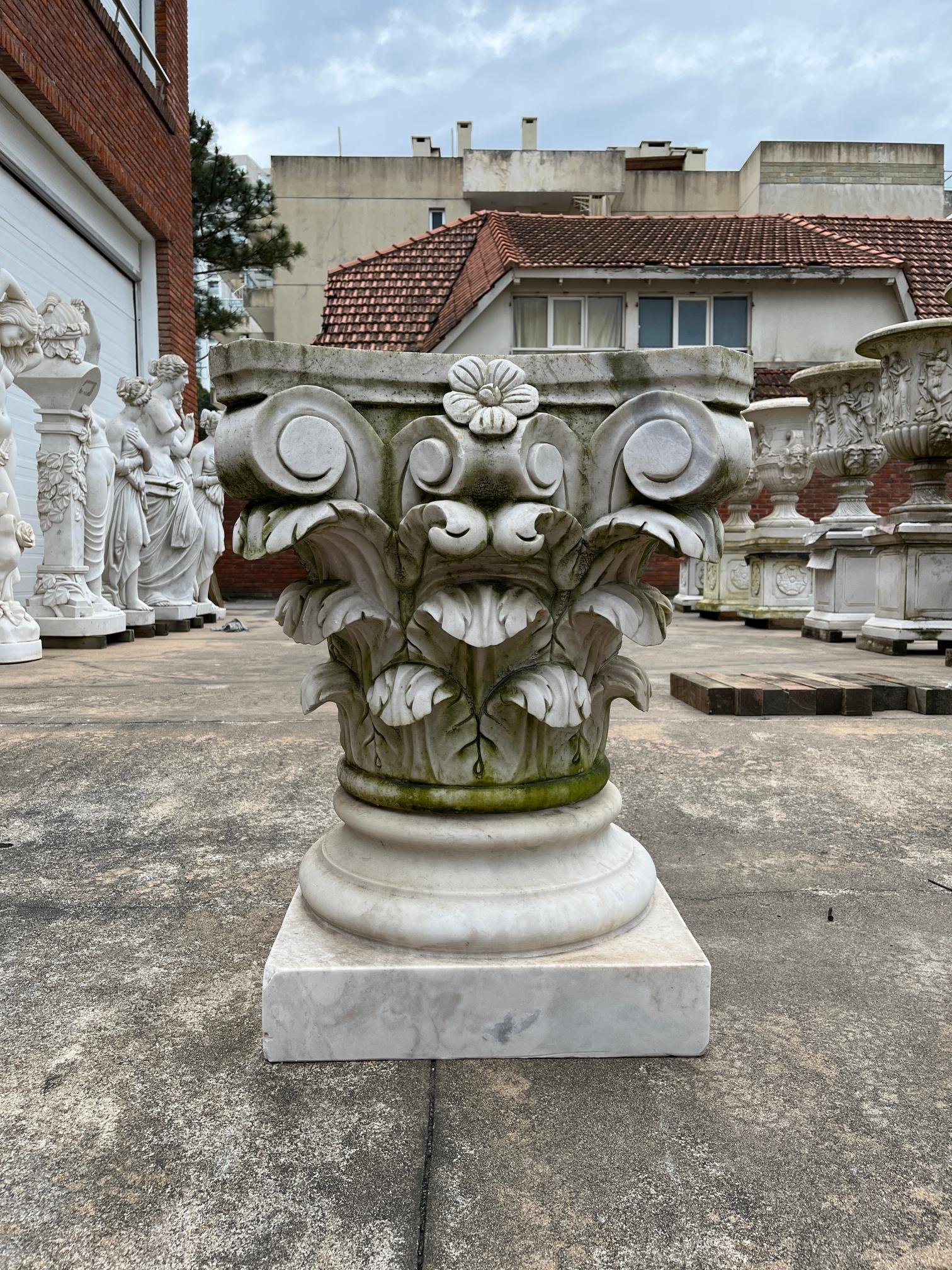 Par de capiteles corintios en mármol blanco veteado, con pedestales en mármol liso. Alto total 76 cm. Ancho 56 cm. Profundidad 56 cm.