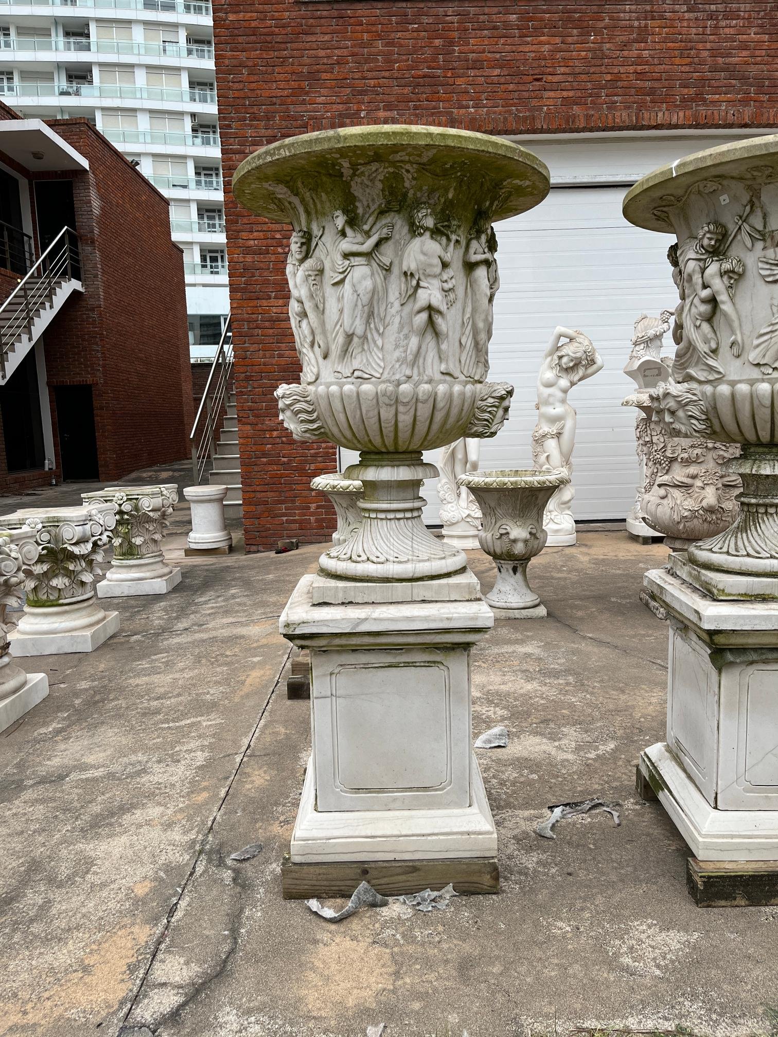 Par de copones en mármol blanco veteado, con friso tallado «personajes griegos», laterales tallados «máscaras» y guarda lobulada. Presentados sobre pedestales en mármol blanco veteado, de base cuadrada. Alto total 158 cm. Diámetro 75 cm.