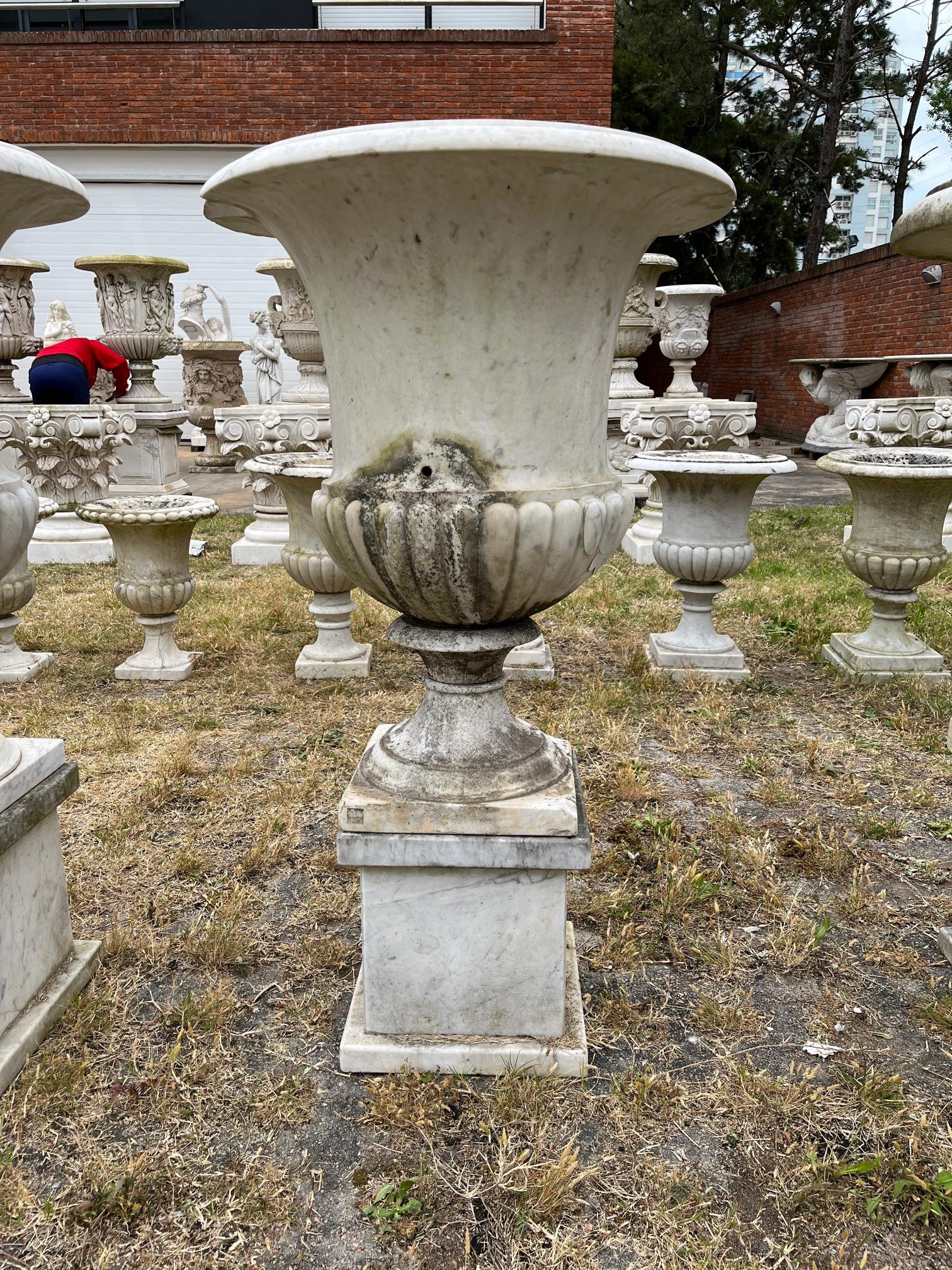 Par de copones en mármol blanco veteado con friso lobulado, sobre pedestales cuadrados. Alto 100 cm. Diámetro 63 cm.