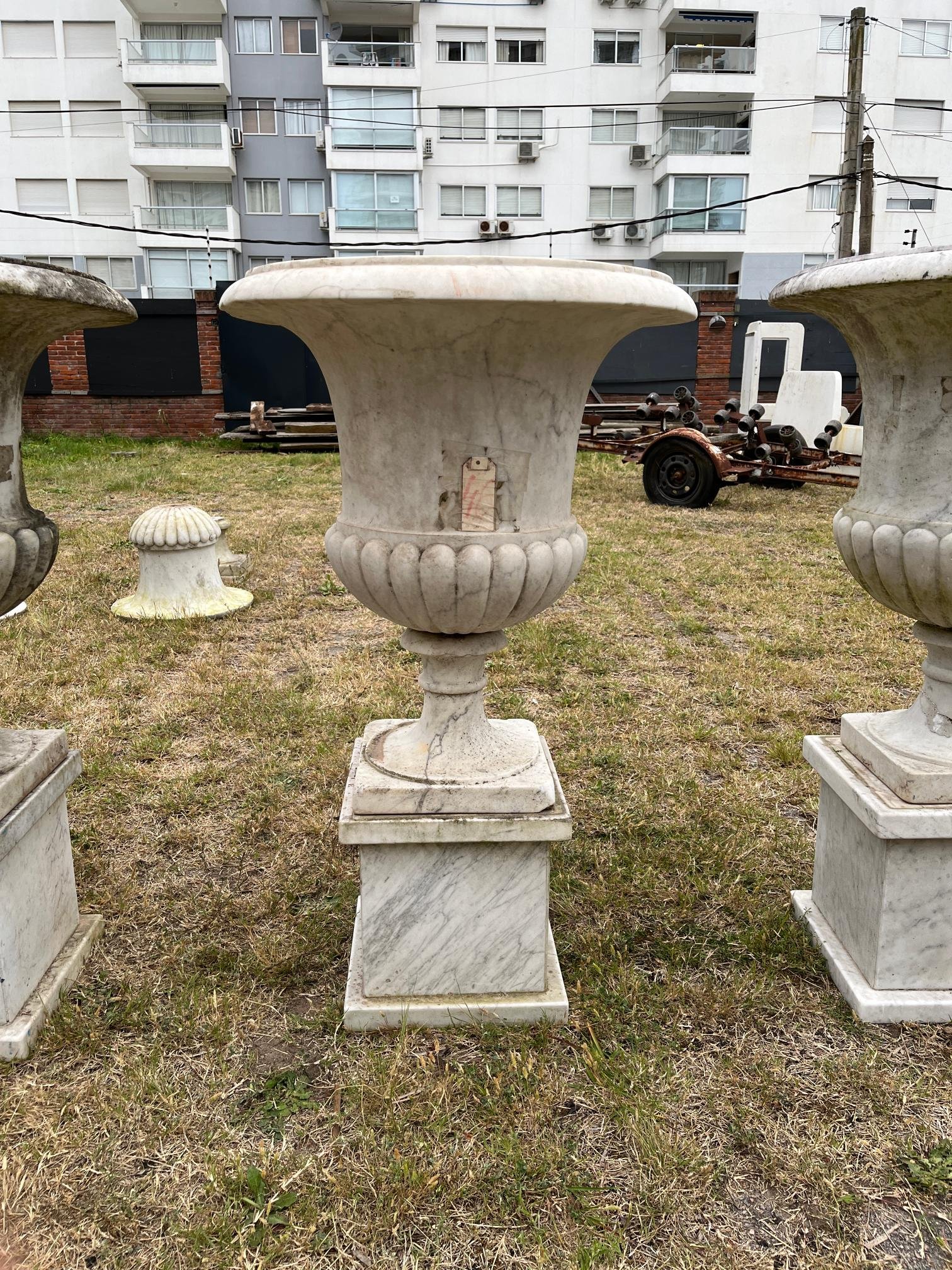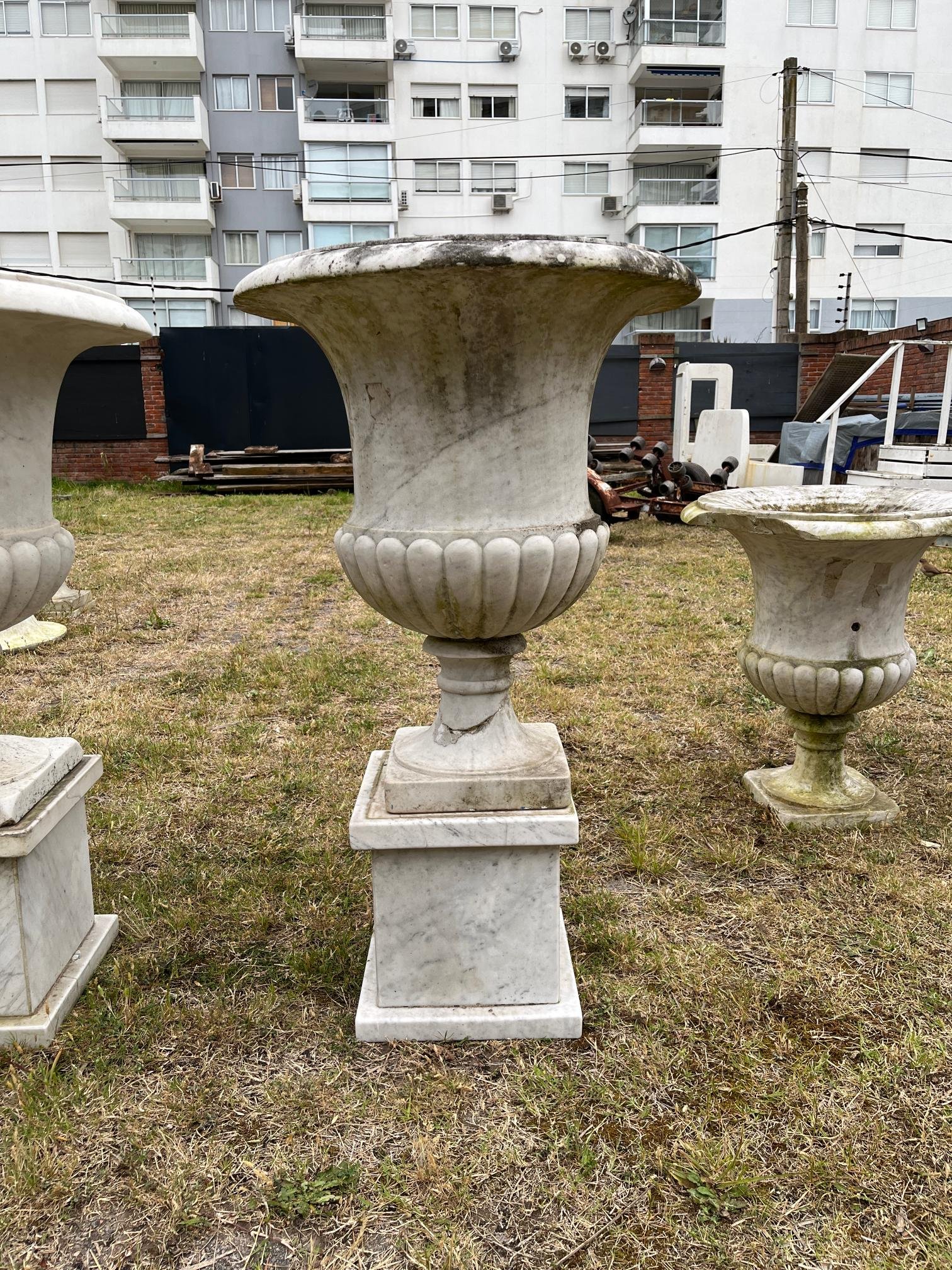 Par de copones en mármol blanco, con friso lobulado, sobre pedestales cuadrados Alto 100. Diámetro 65 cm.