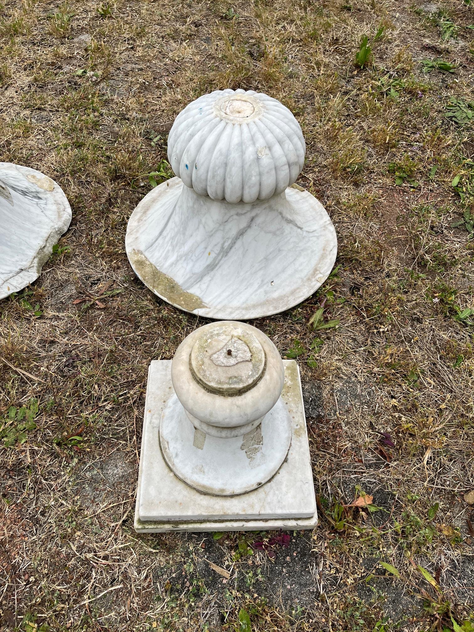 Par de copones en mármol blanco veteado con friso lobulado. Alto total 70 cm. Diámetro 45 cm. Desarmados, averiados y con faltantes.