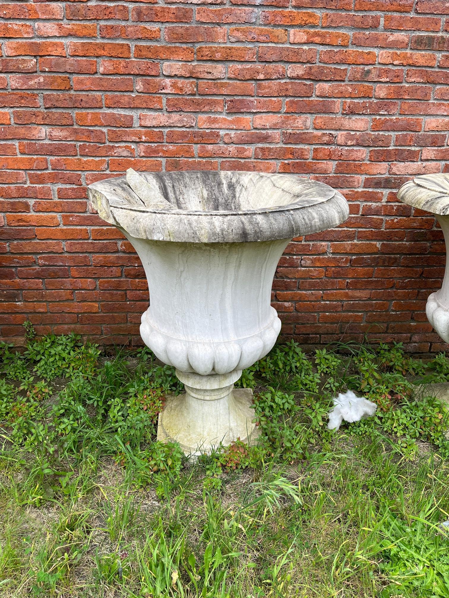 Par de copones en mármol blanco con friso lobulado. Alto 100 cm. Diámetro 88 cm. Averiados.
